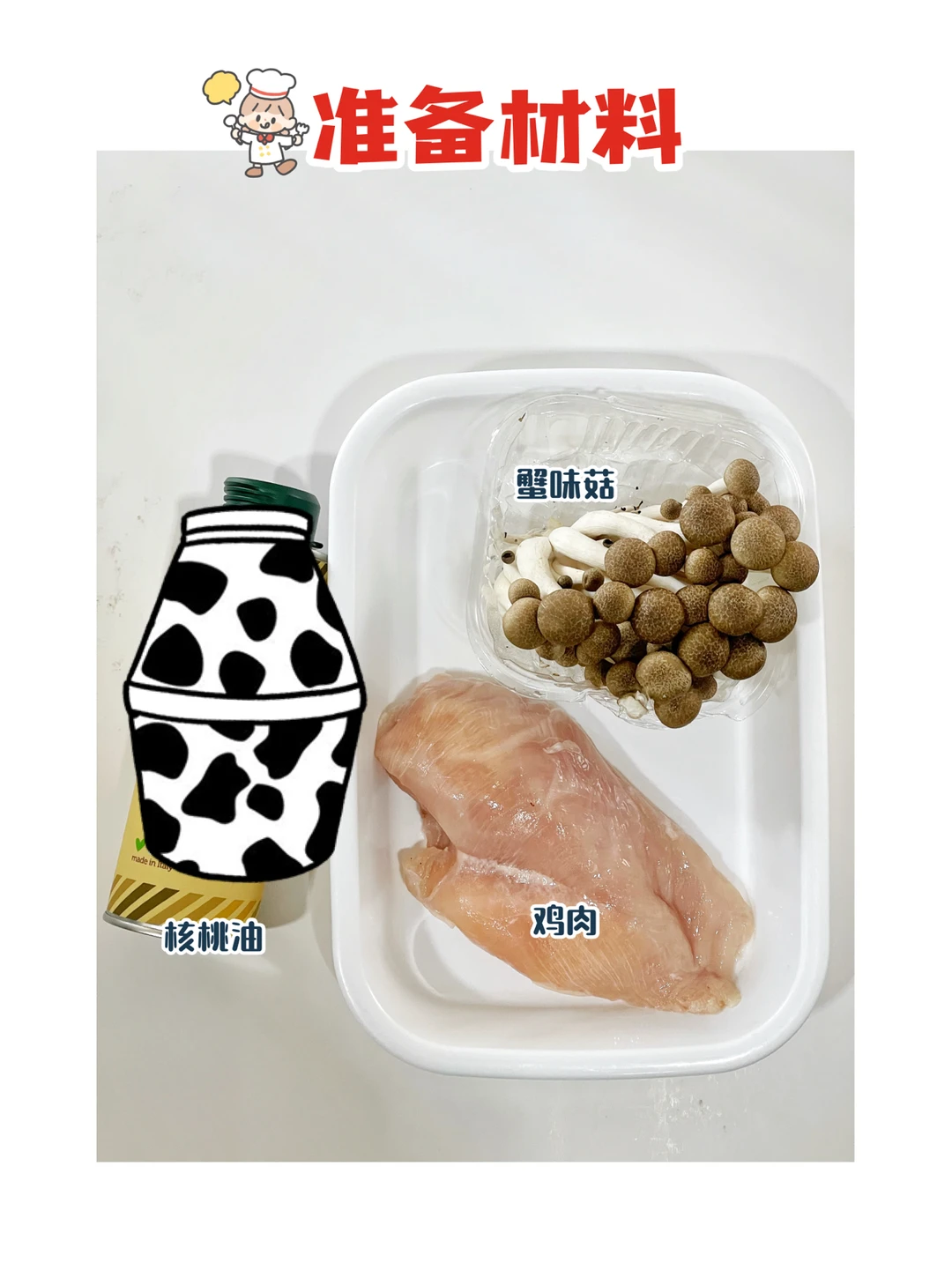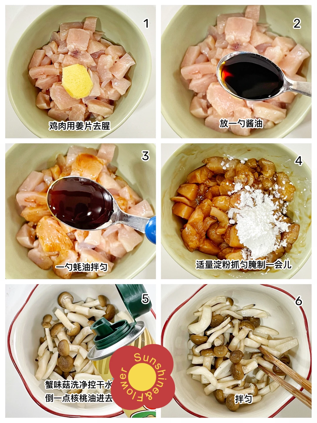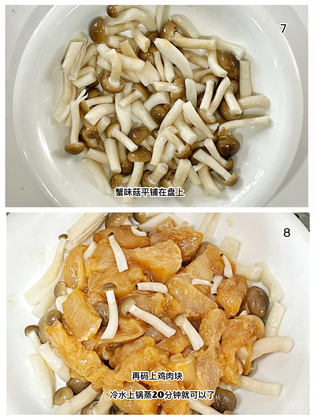 今天给两小只安排了营养美味的菌菇蒸滑鸡,蒸出来的鸡肉滑嫩,汤汁鲜美,不会做饭的麻麻们,按照教程也可以轻松搞定一道硬菜哦[偷笑R]0失败❗️ ✅准备材料:鸡肉、蟹味菇、核桃油。 ⬇️制作方法:⬇️ 🔹鸡肉去筋膜切小块,用姜片去腥。 🔹放一勺酱油,一勺蚝油,适量淀粉抓匀腌制一会。 🔹腌的时候可以处理蘑菇。蟹味菇洗净,控干水份,倒入一点核桃油拌匀。 🔹把蟹味菇平铺在盘子上,在上面再码上腌制好的鸡肉块,冷水上锅蒸20分钟就可以啦。 💕这道菜配米饭或者面条都超下饭哦[斜眼R]