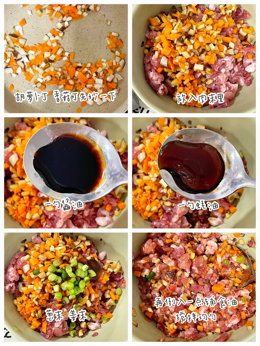 🔹胡萝卜、香菇切丁,油热后炒一下,放入肉末里。