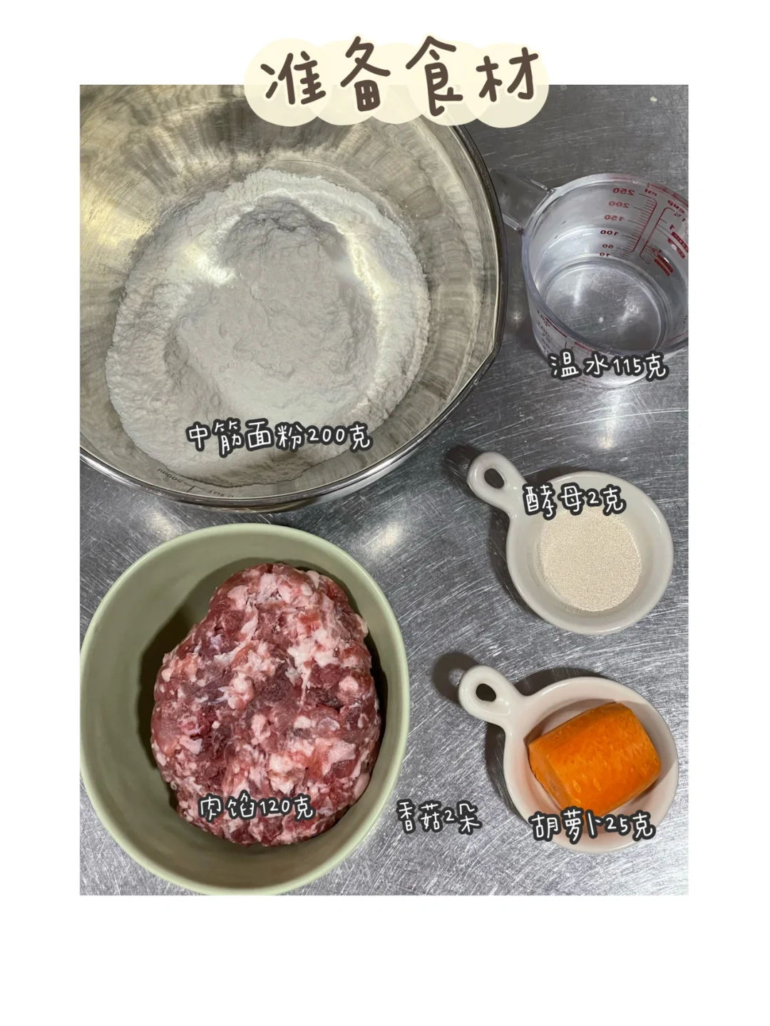 ✅准备食材:中筋面粉200克、肉馅120克、温水115克、香菇2朵(大的1朵)、胡萝卜25克、温水115克。