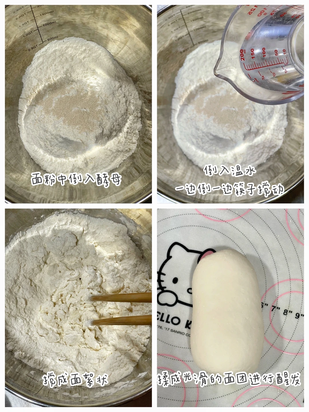 🔹面粉中放入酵母。倒入温水(一边倒一边用筷子搅拌)搅成面絮状。揉成光滑的面团就行醒发。
