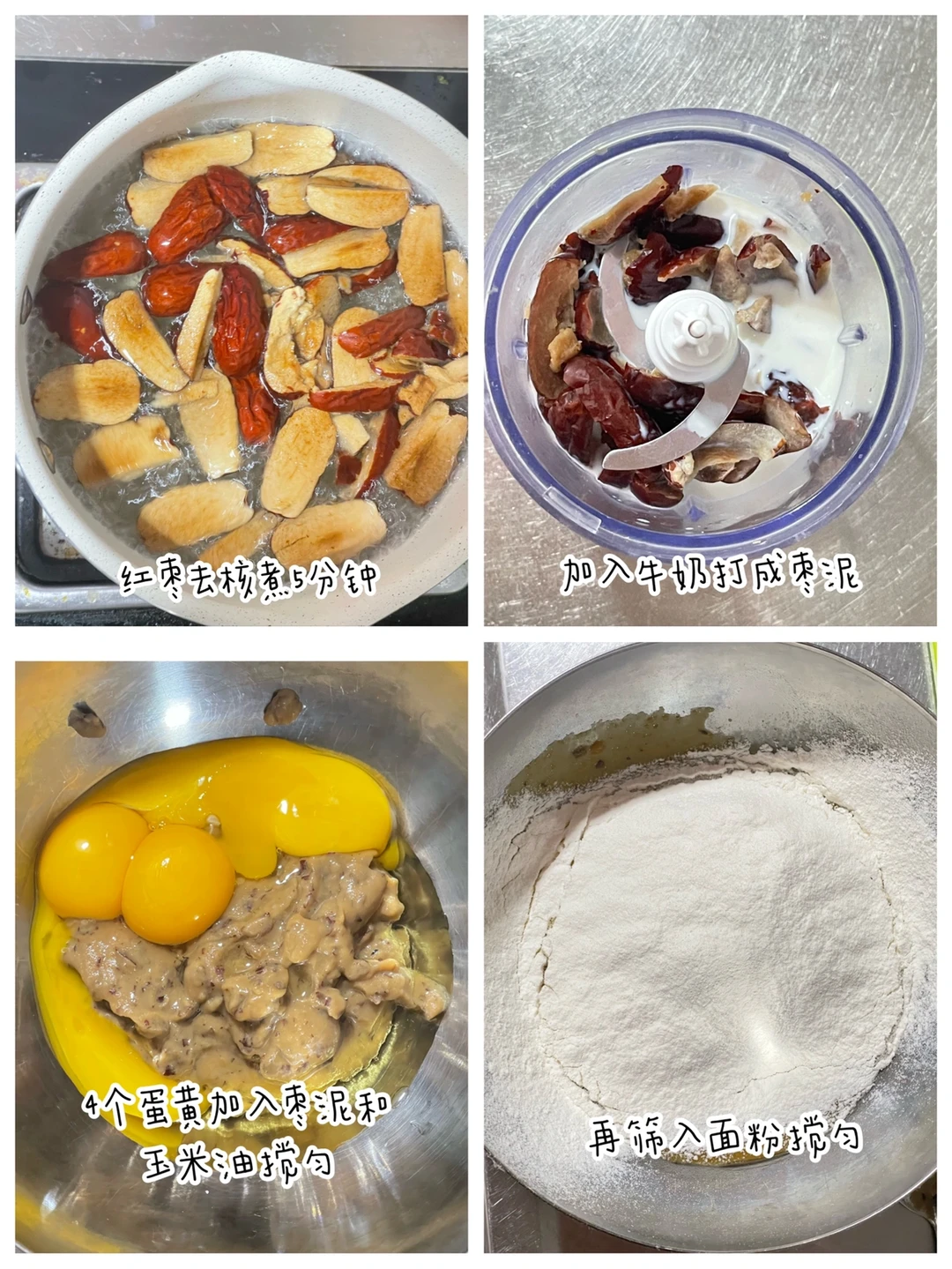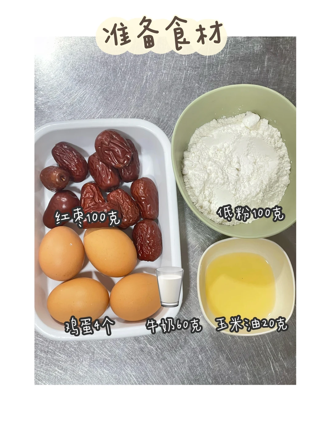 ✅准备食材:低粉100克、红枣100克、鸡蛋4个、牛奶60克、玉米油20克.
