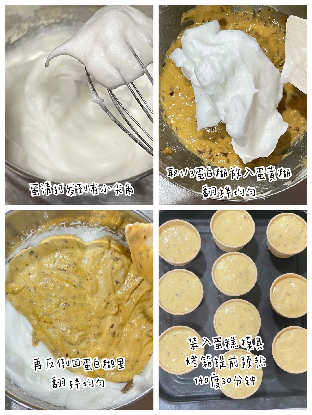🔹蛋白打发到提起打蛋器有小尖角.取1/3蛋白糊放入蛋黄糊里翻拌均匀.再反倒回蛋白糊里翻拌均匀.