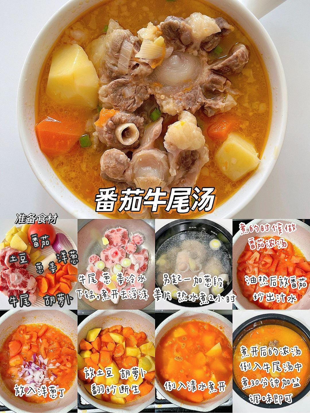 🔹制作方法:牛尾+葱段+姜片冷水下锅焯水,温水洗净。另起一锅,牛尾,葱段、姜片加热水中小火煮2个小时,再放入番茄浓汤继续煮30分钟加盐调味即可。