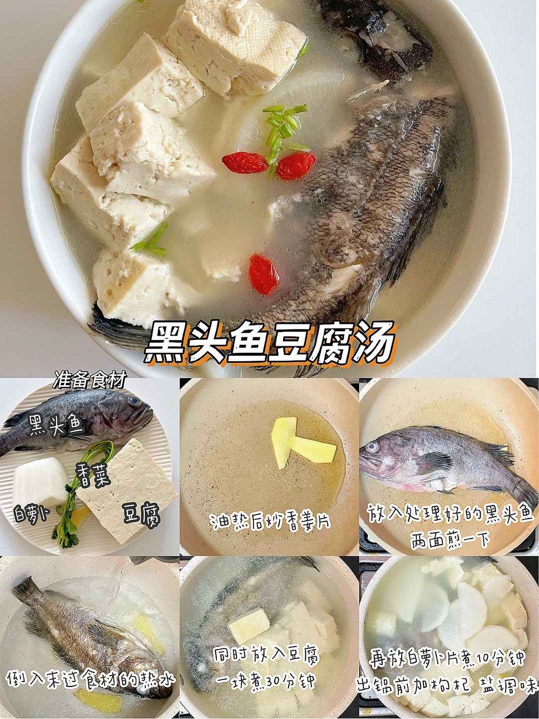 🔹制作方法:锅中油热后炒香姜片,放入处理好的黑头鱼,两面煎一下。倒入适量的热水,饭入豆腐块,煮开后转中小火煮30分钟,再放入白萝卜继续煮10分钟,出锅前加枸杞、盐调味