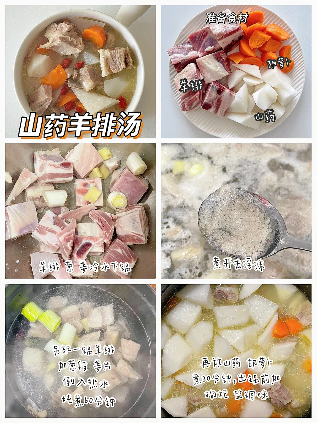 🔹制作方法:羊排、葱、姜冷水下锅煮开去浮沫。另起一锅羊排加葱段、姜片倒入适量热水炖煮60分钟,再放入山药、胡萝卜煮30分钟,出锅前加枸杞、盐调味.