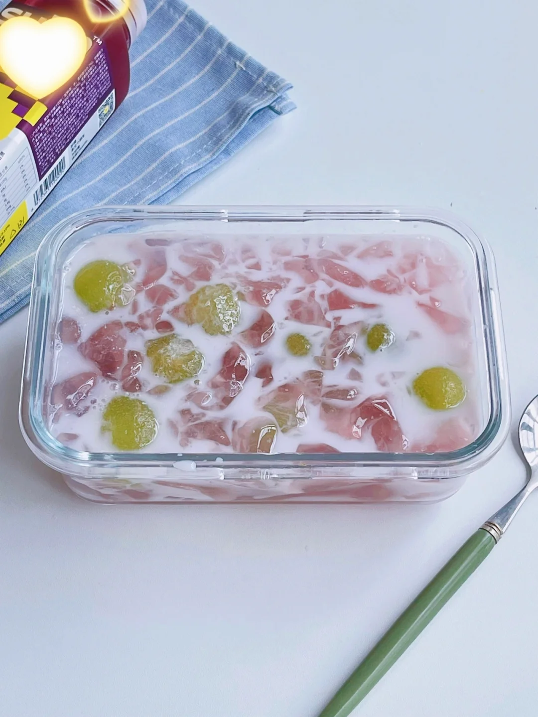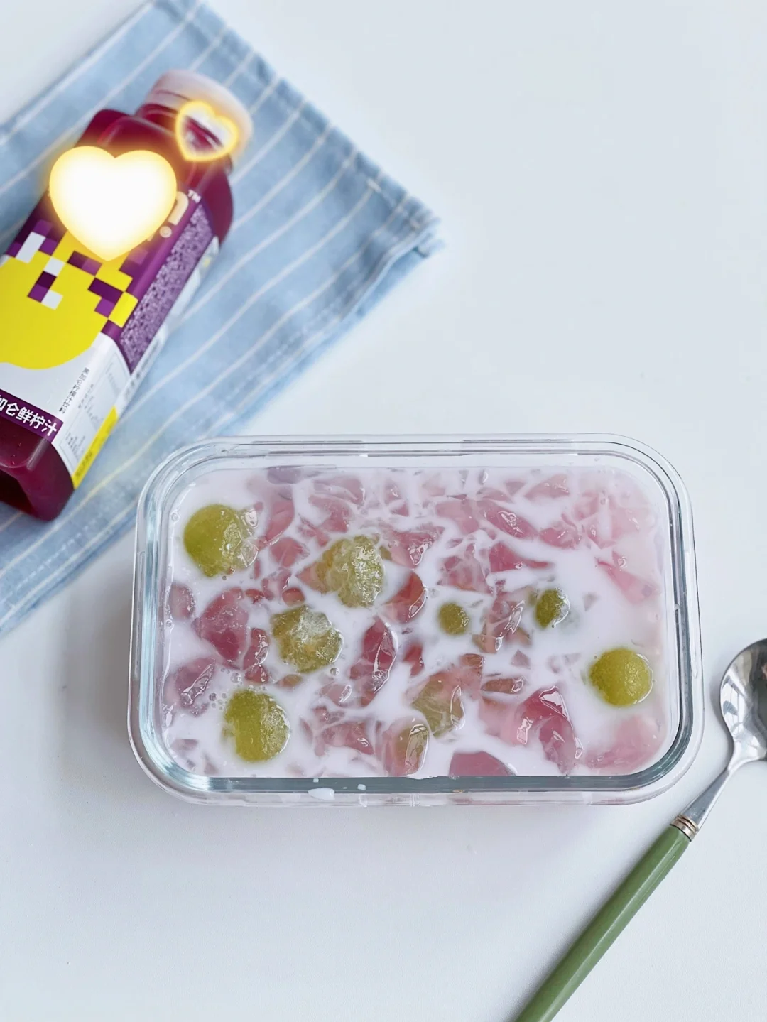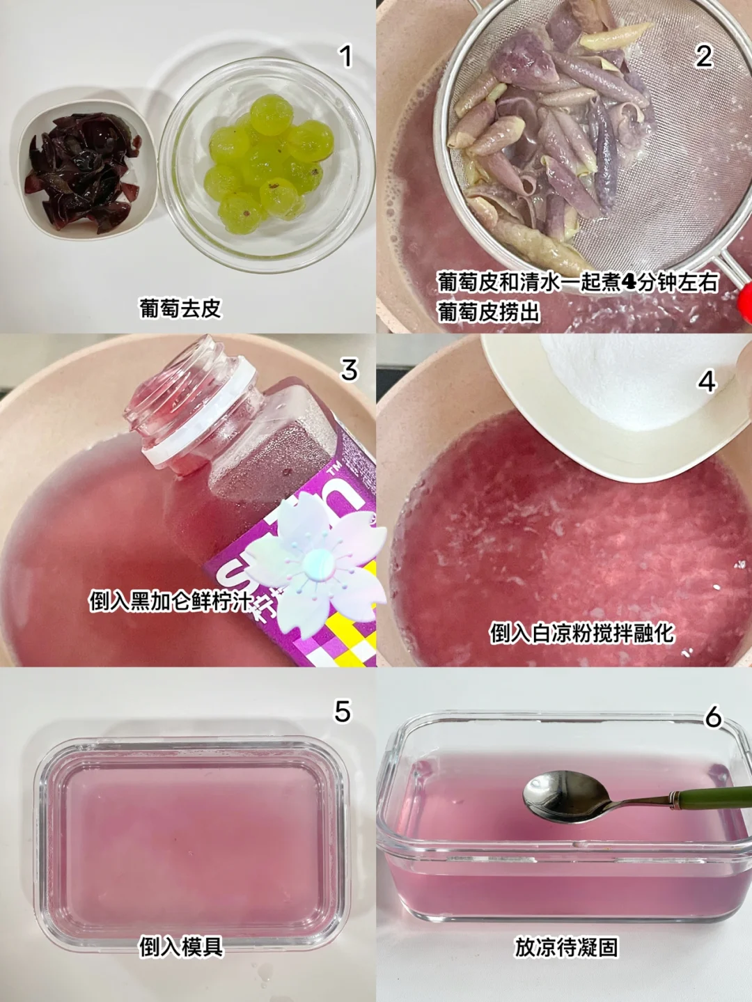 ✅准备材料:葡萄120克、白凉粉30克、黑加仑鲜柠汁、牛奶适量、清水800毫升。