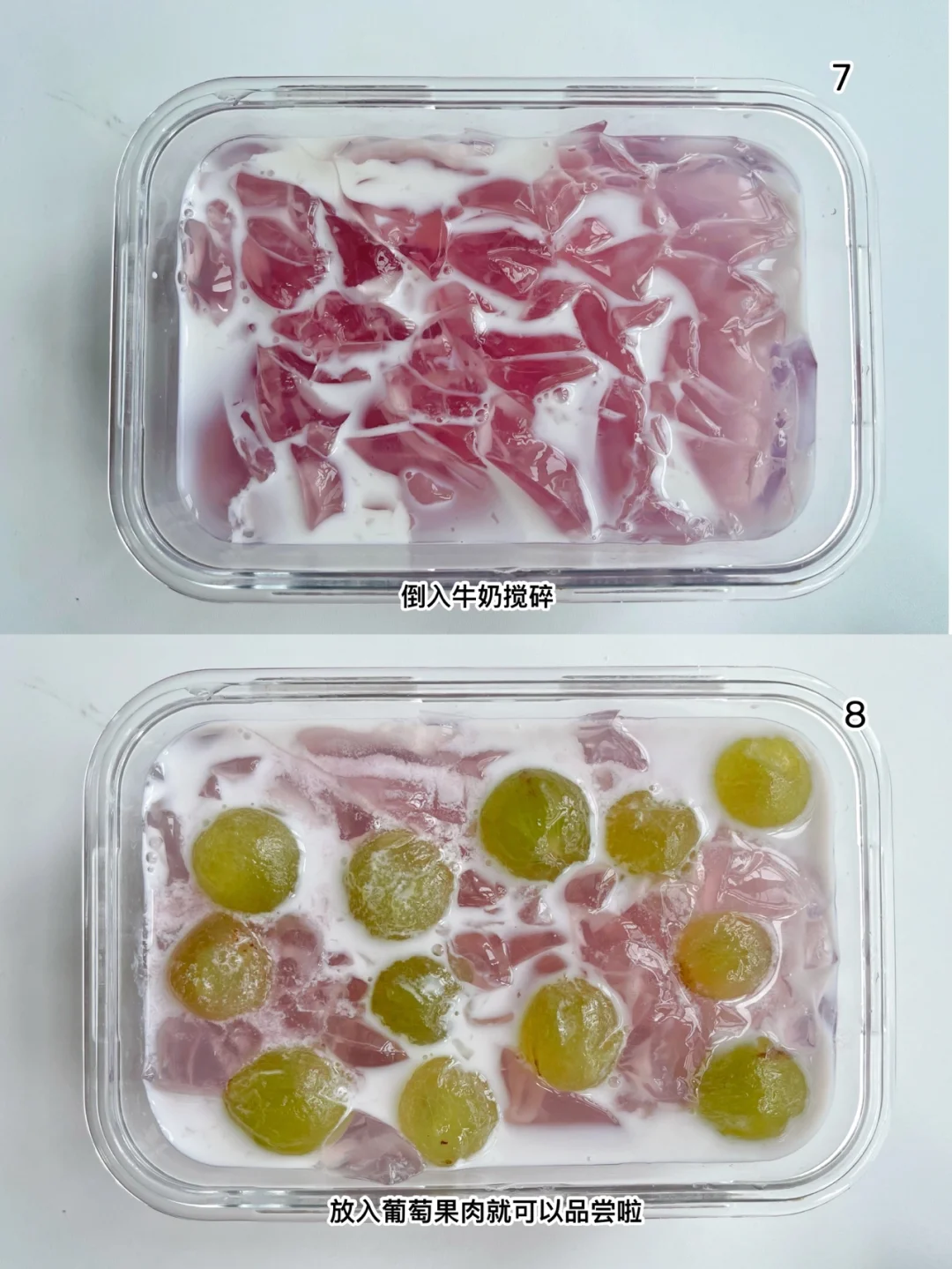 🔹倒入适量的牛奶搅碎,放入葡萄果肉就可以啦。