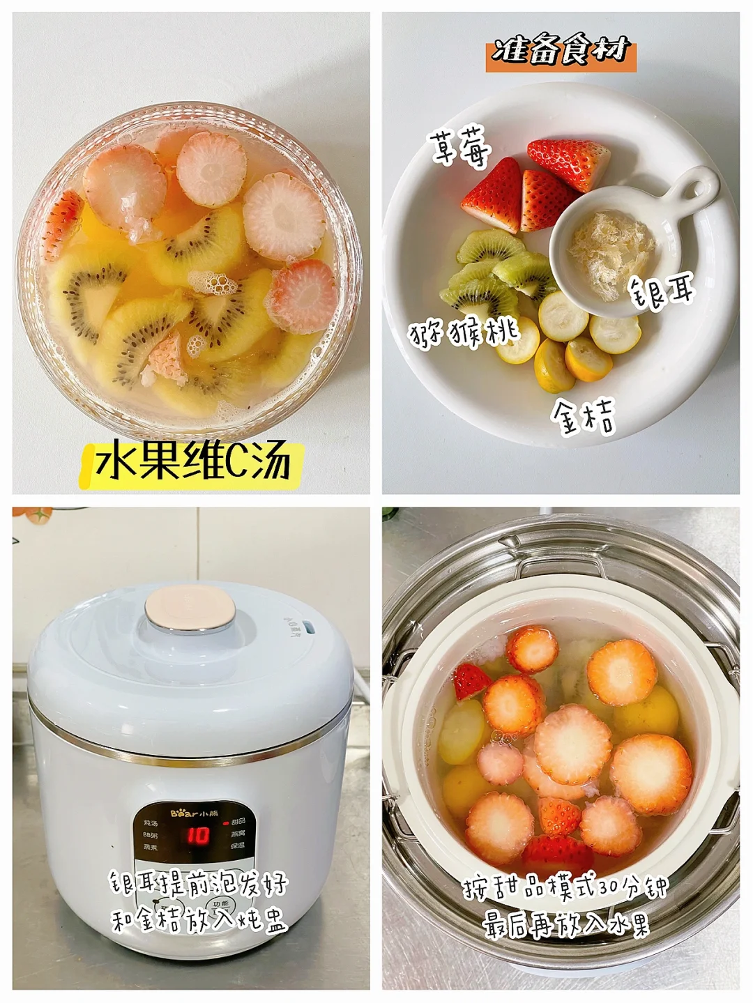 🔹制作方法:银耳提前泡发好,金桔一切二。银耳+金桔+适量清水放入电炖盅煮30分钟,最后放入草莓和猕猴桃