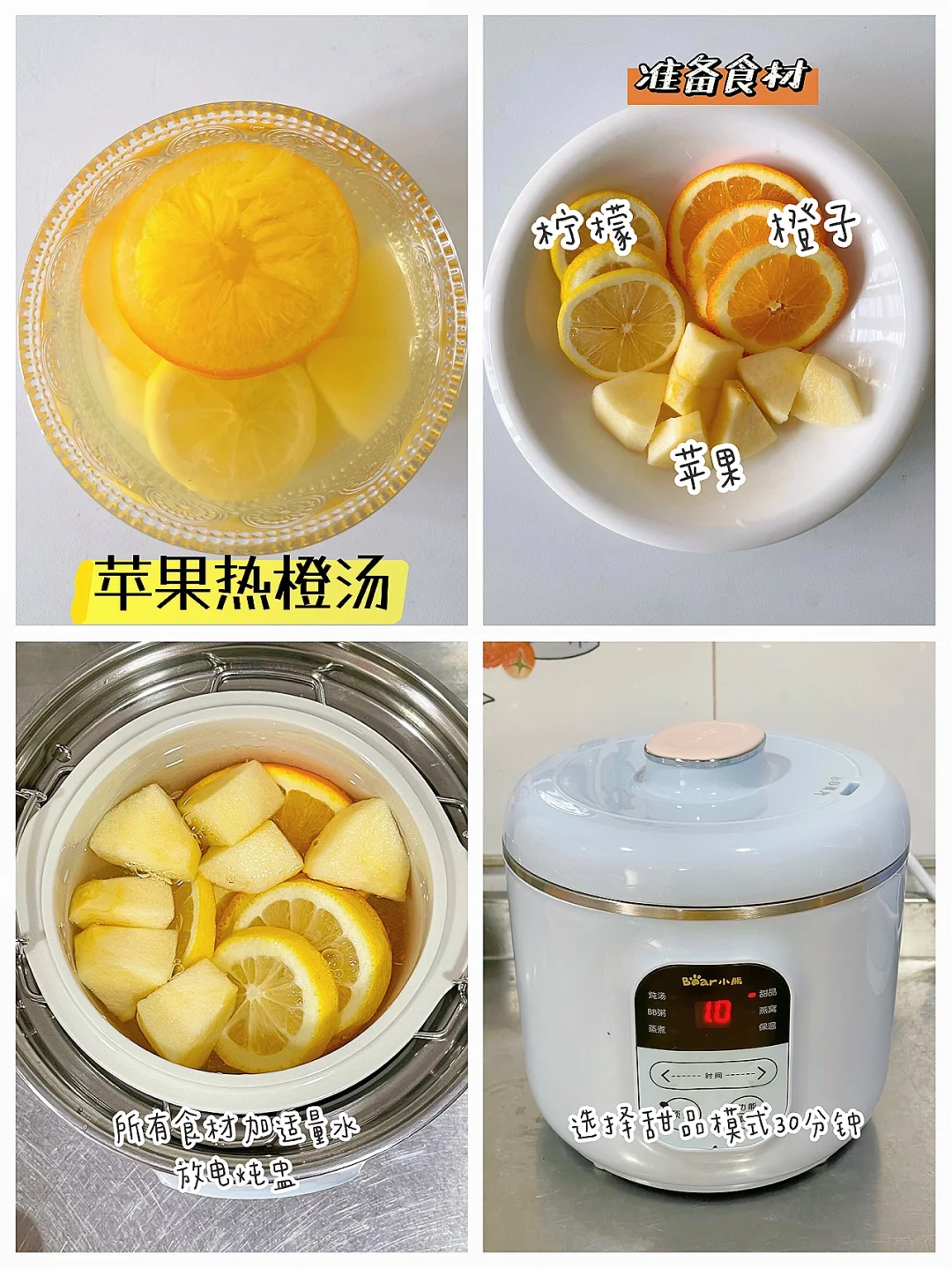 🔹制作方法:苹果去皮切块,柠檬、橙子洗净外皮切片。所有食材加适量清水放电炖盅煮30分钟