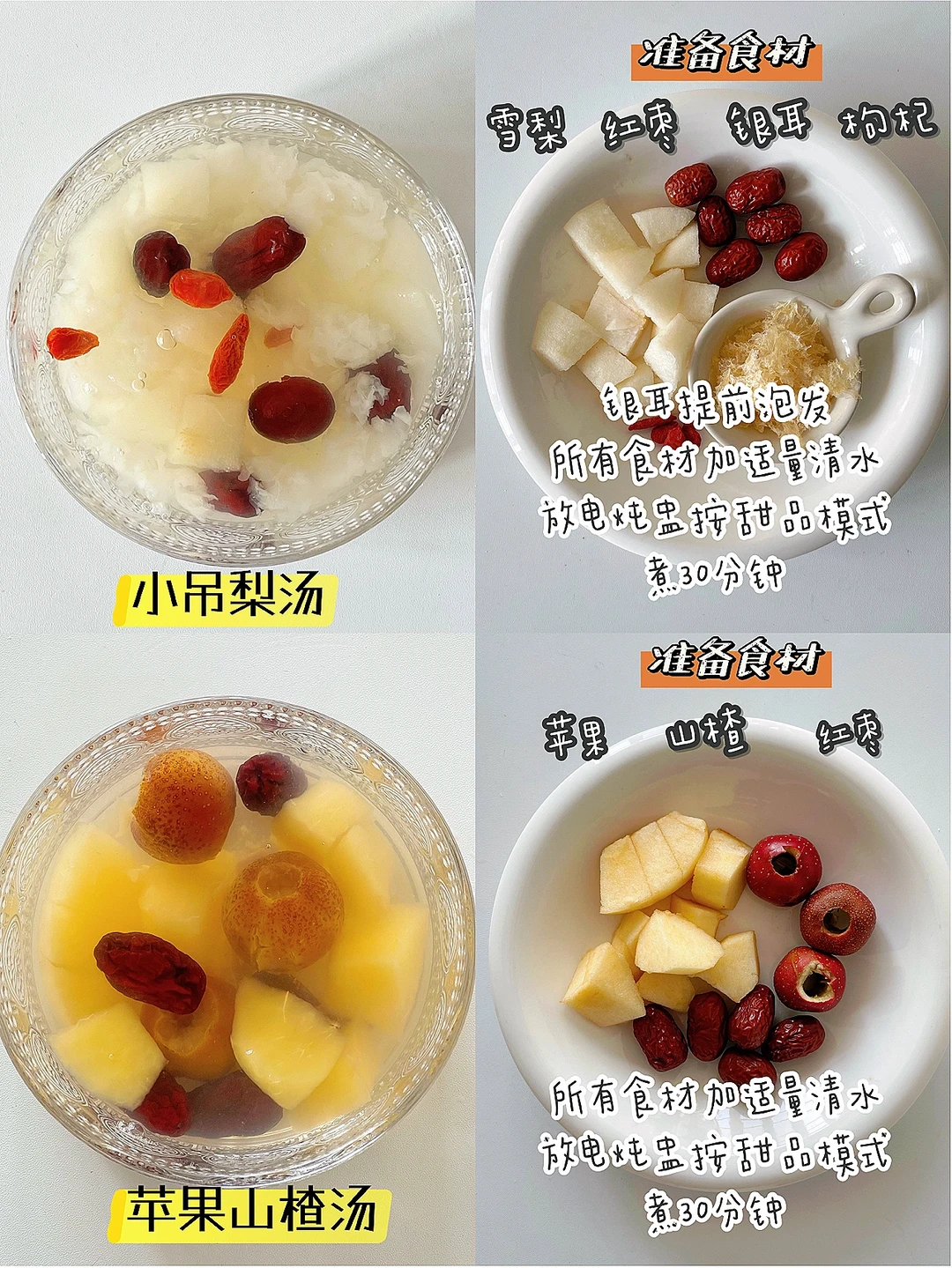 🔹制作方法:银耳提前泡发好,雪梨去皮切块。所有食材加适量清水放入炖盅,煮30分钟。