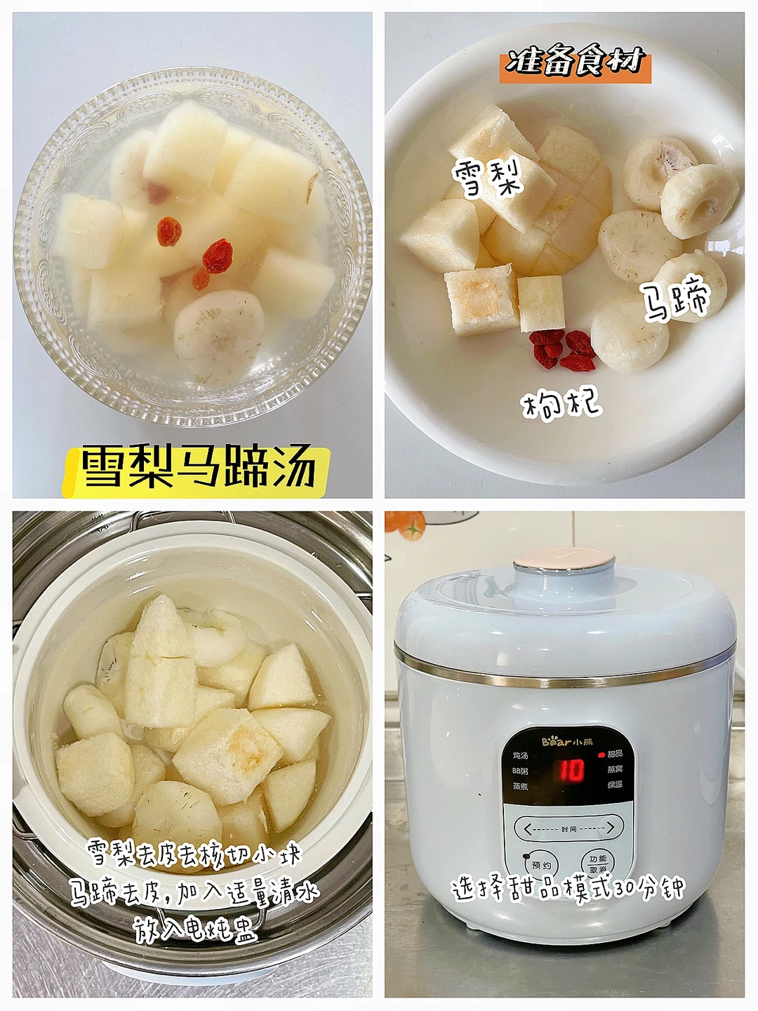 🔹制作方法:雪梨去皮切块,马蹄去皮。所有食材放入电炖盅煮30分钟即可。