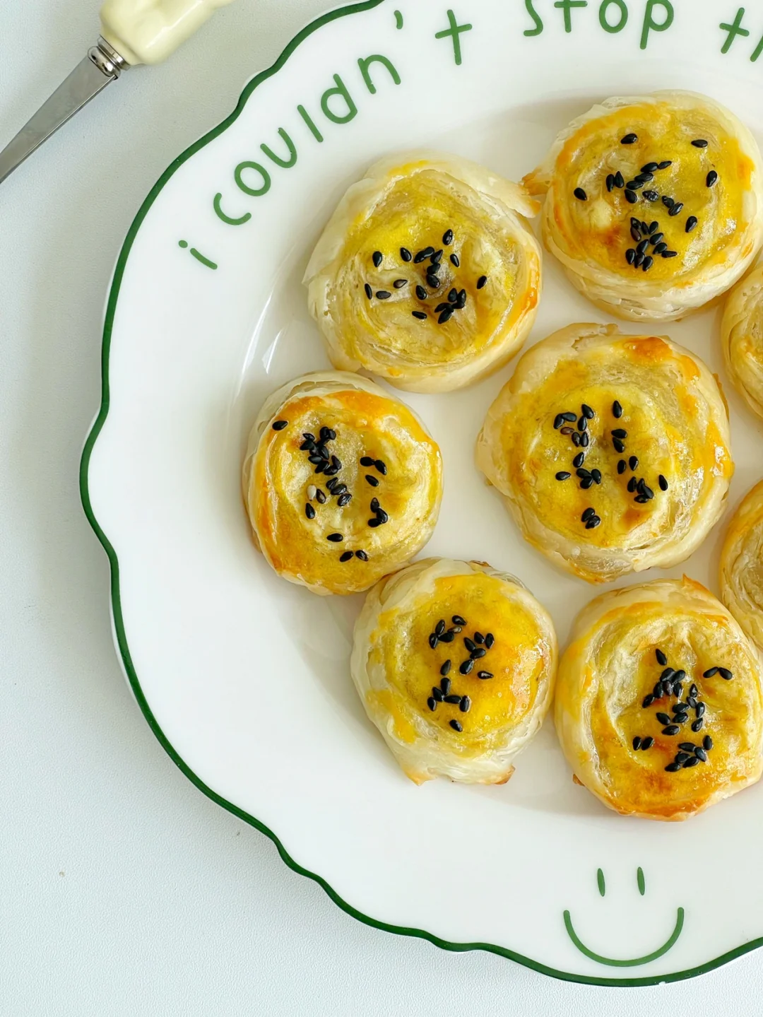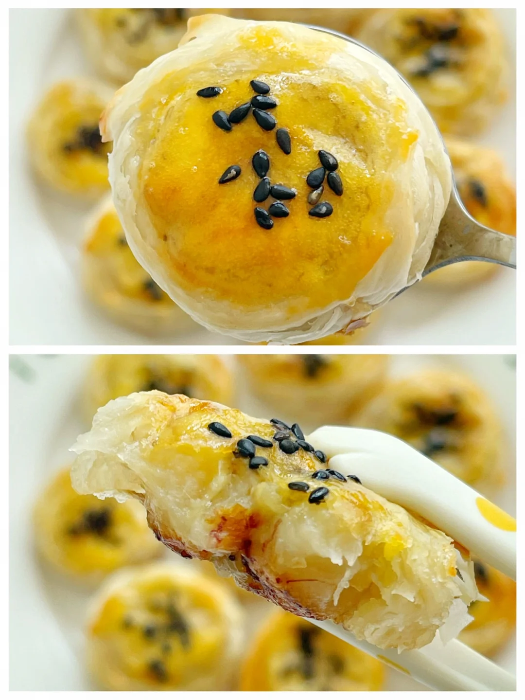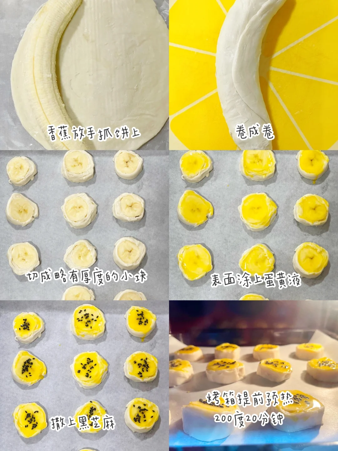 今天分享个好吃的小零食做法,无需揉面,用手抓饼就可以轻松搞定. ✅准备食材:香蕉、手抓饼,蛋黄. ⬇️制作方法:⬇️ 🔹香蕉摆手抓饼上,卷成卷,切成略有厚度的小块. 🔹表面涂上蛋黄液,表面撒上黑芝麻. 🔹放入预热好的烤箱,200度20分钟 ❗️给宝宝吃建议选择黄油版手抓饼.