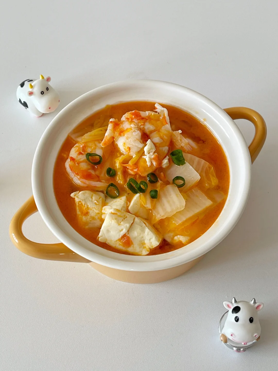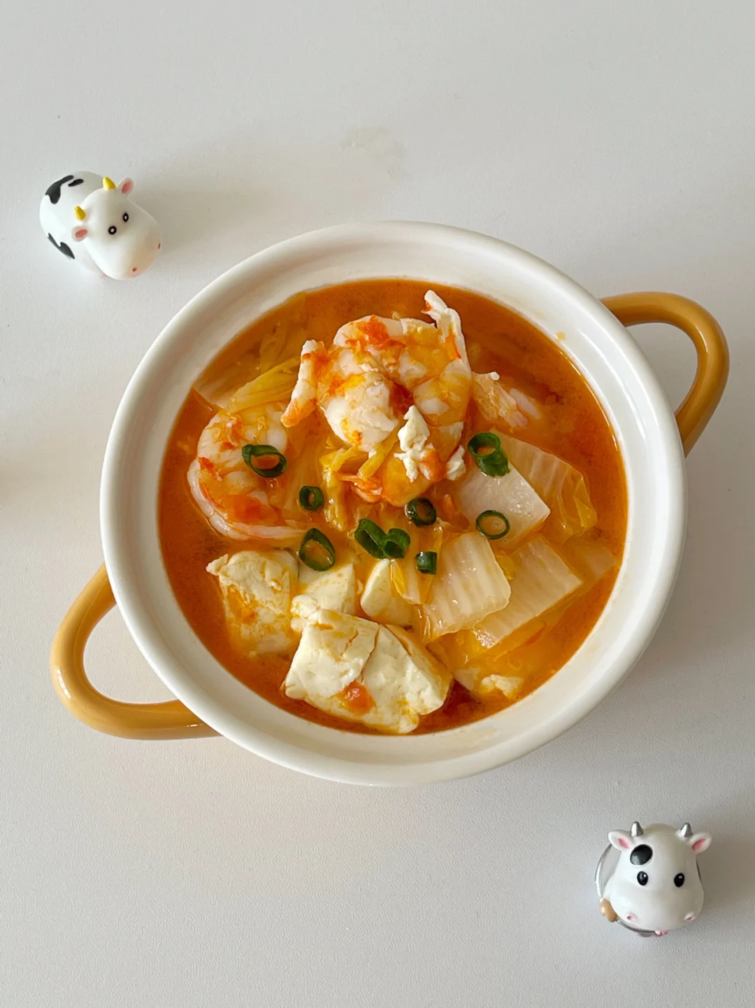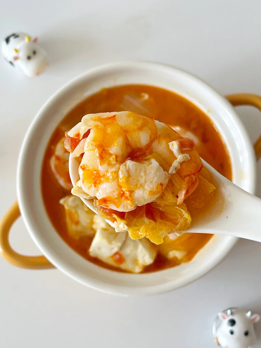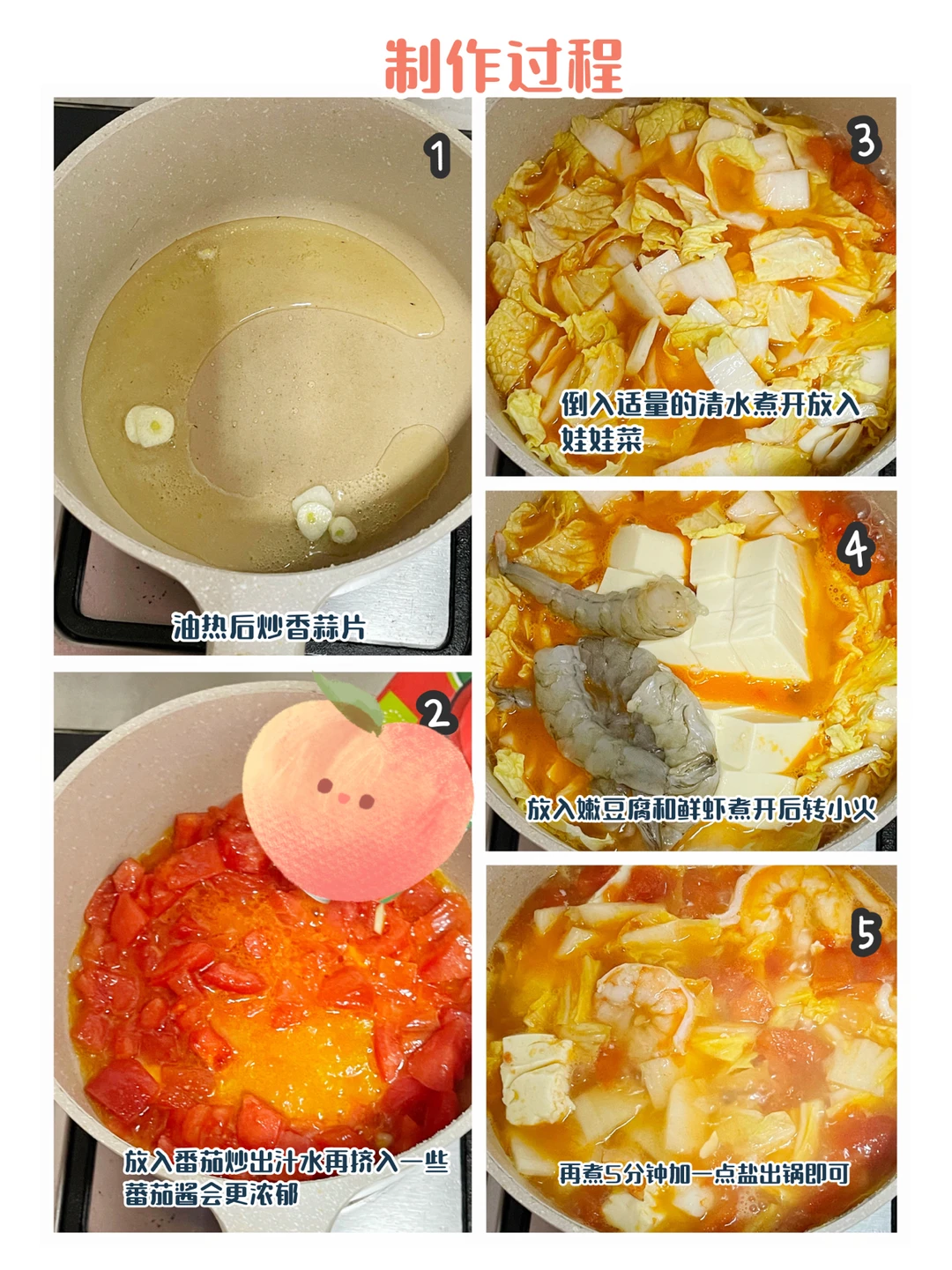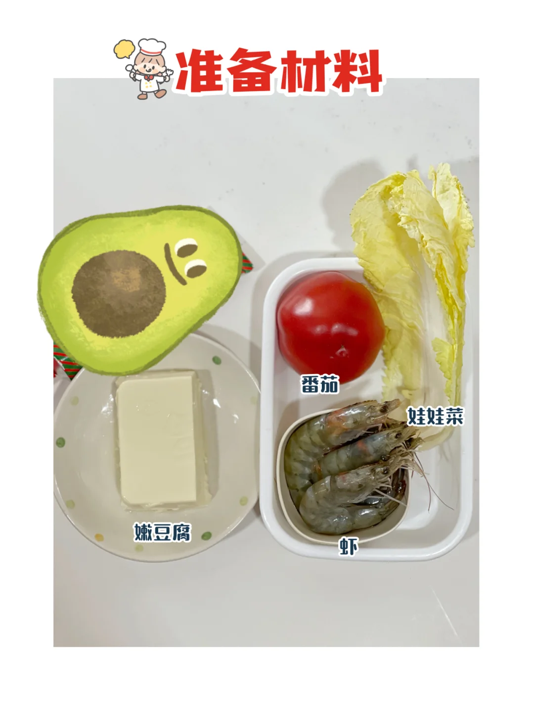 中午给宝宝和自己做了一款味道鲜美的番茄浓汤,给宝宝配上米饭简直太下饭了(配面条也可)我作为减脂汤也很是适合[害羞R] ✅准备材料:番茄、虾、娃娃菜、嫩豆腐、番茄酱。 ⬇️制作方法:⬇️ 🔹番茄去皮切小丁,娃娃菜切小块,虾去皮去虾线。 🔹锅中油热后,炒香几片蒜片,放入番茄丁炒出汁水,再挤入一些番茄酱(这样汤的味道会更浓郁)倒入适量的清水,煮开后放入娃娃菜、豆腐和虾,煮开转小火,再炖煮5分钟,加一点盐出锅即可。 ⚠️10+宝宝就可以尝试,不加盐,食材性状根据宝宝咀嚼力相应调整一下。