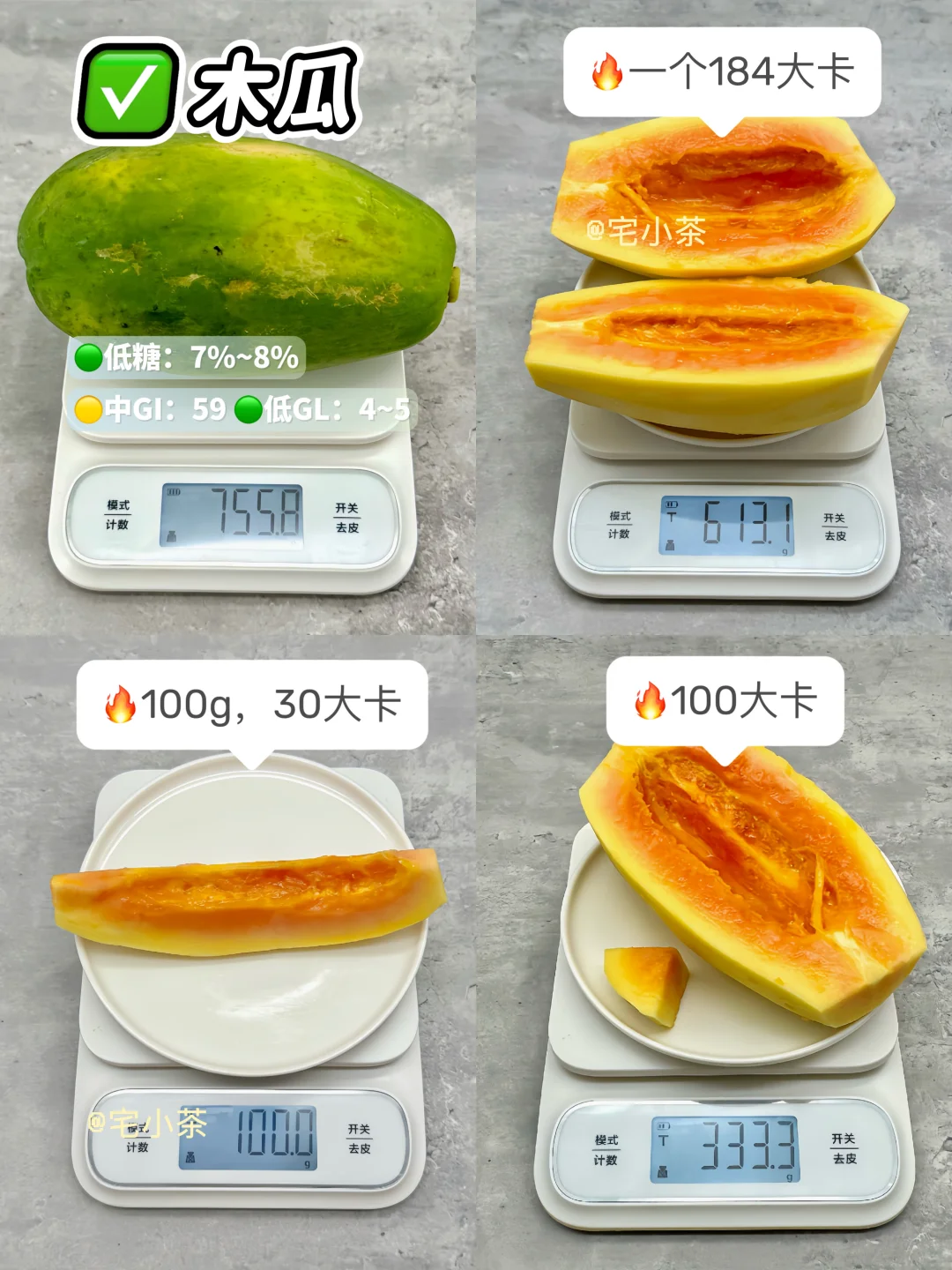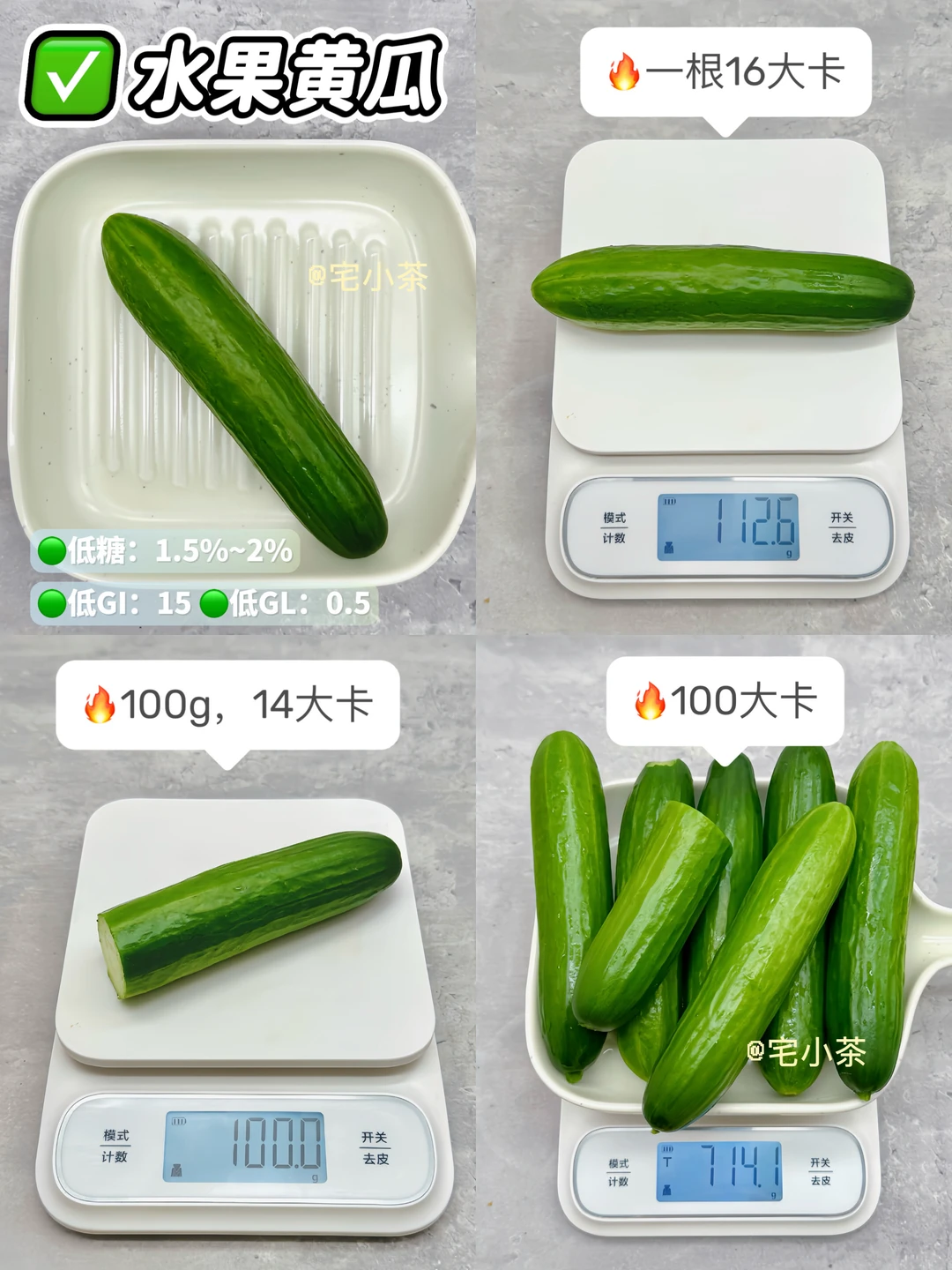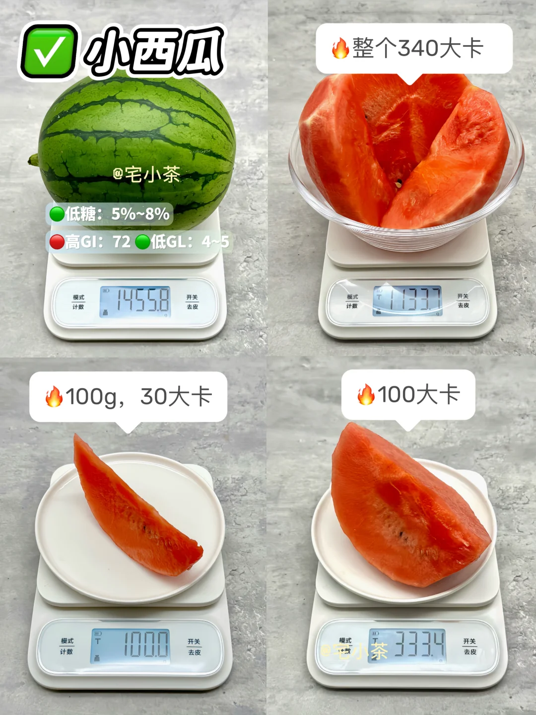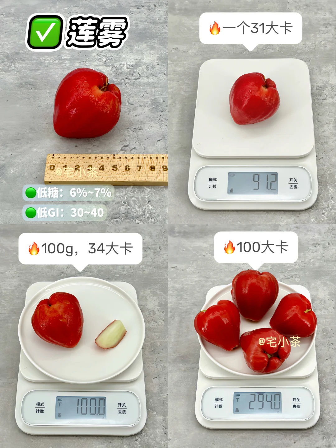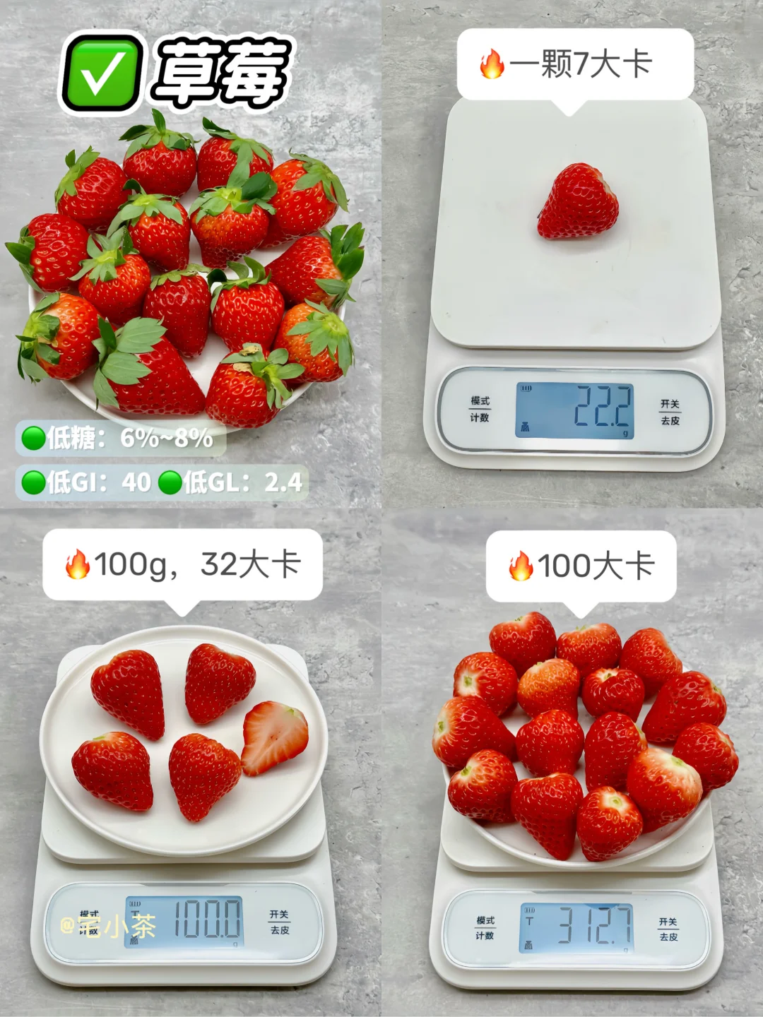 哈喽大家好呀,本期是低卡水果热量合集~ 🔸水果热量拆分为单个/100g/100大卡,含糖量/GI值/GL值也附在图上了,便于大家参考。 *热量均根据可食用净重测算,不一一备注。 · ✅草莓 ✅小西瓜 ✅杨桃 ✅木瓜 ✅小番茄/圣女果 ✅水果黄瓜 ✅莲雾