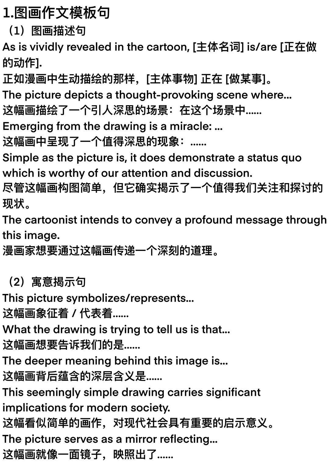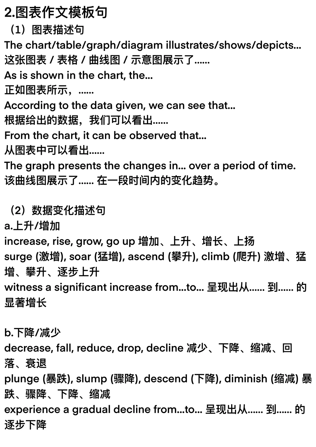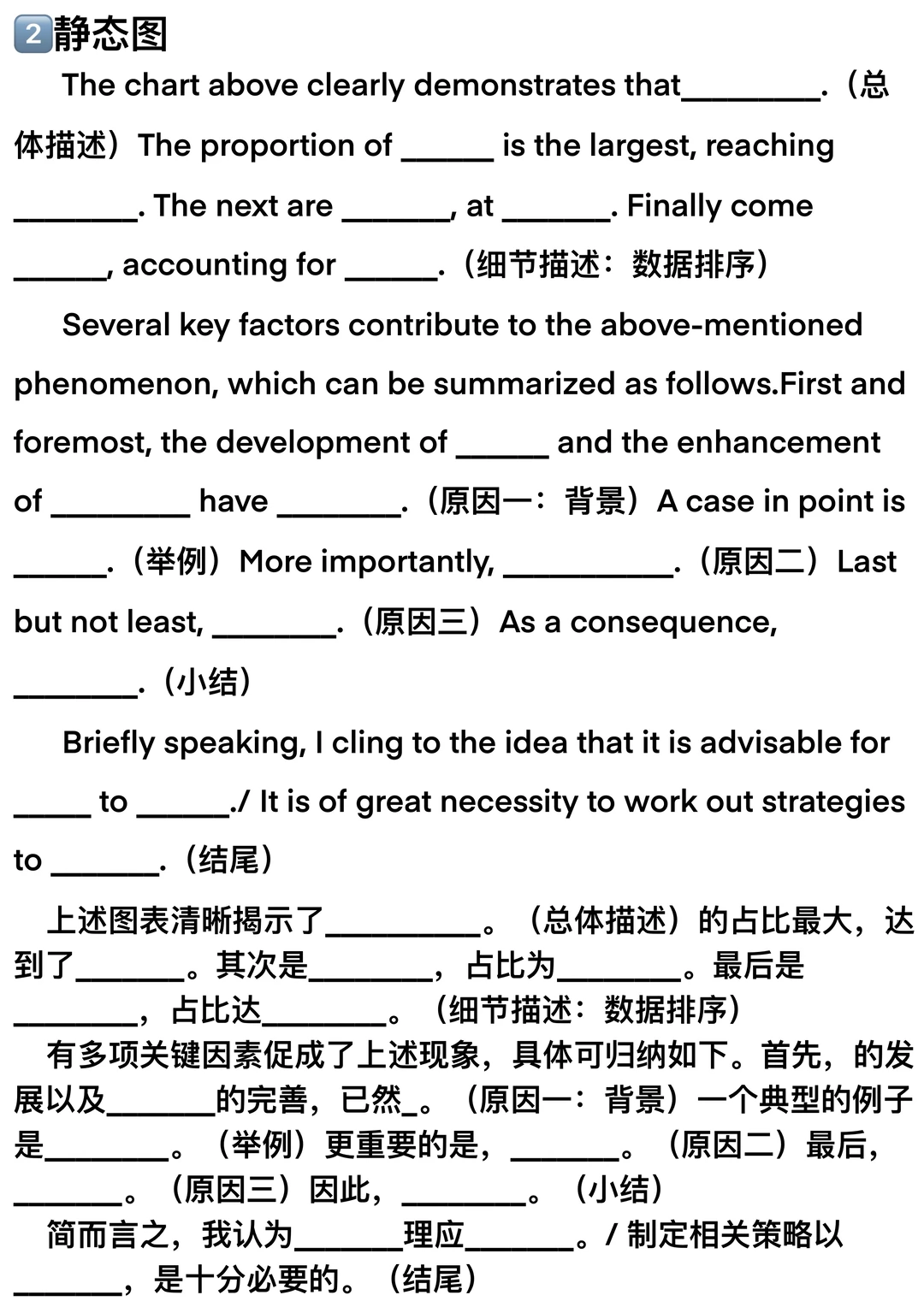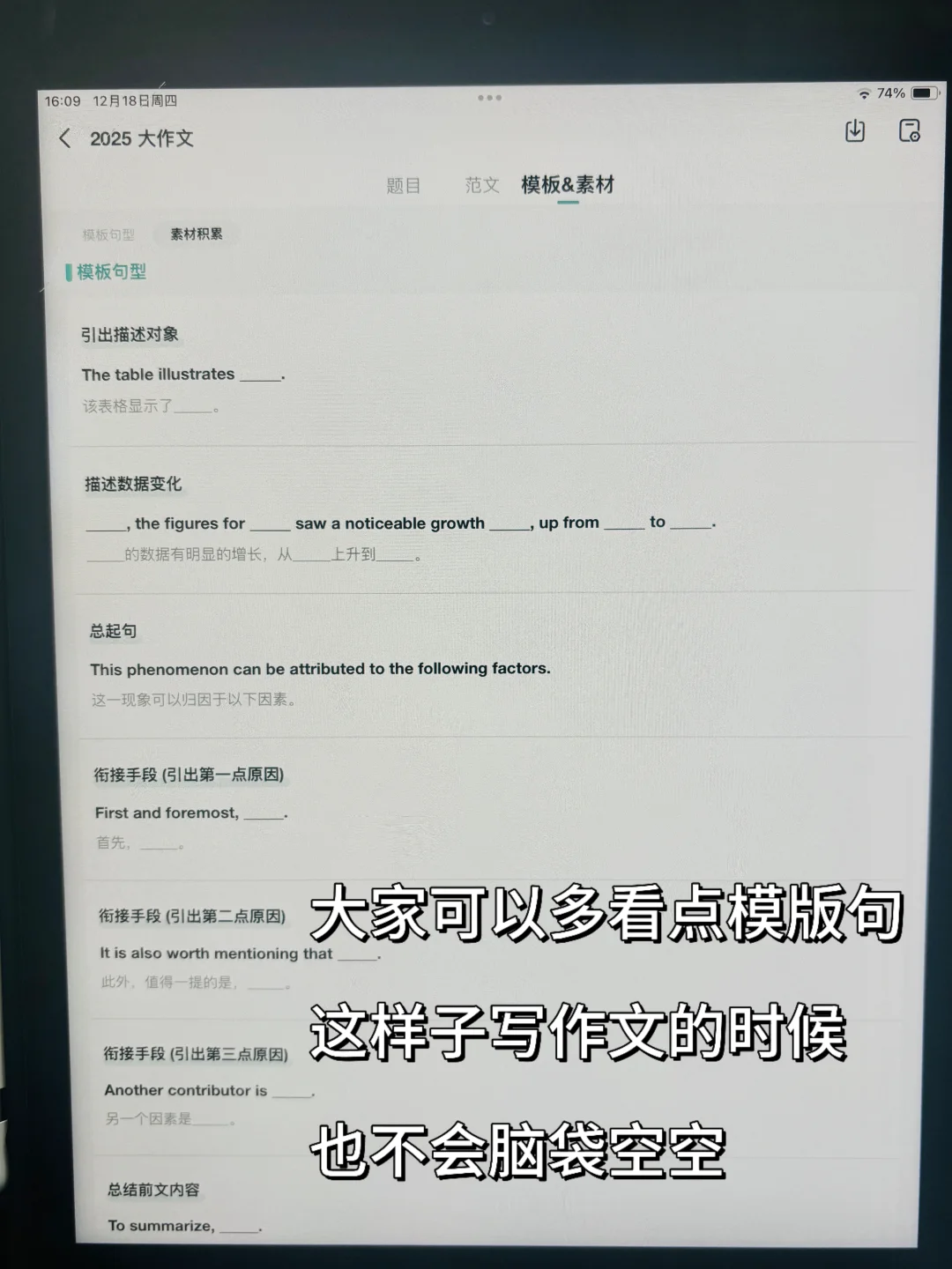 距离26考研还有不到两天,最后一段路,请大家从容地走完它~ 给大家提供了三种考研英语大作文模板,分别是 ①图表作文(静态图表+动态图表) ②图画作文 ③材料作文 同时提供了作文中可能会用到的模板句↓ ①图画描述句+寓意揭示句 ②图表描述句+数据变化描述句 ③现象+观点 ④论点展开:列举论点、因果论证、举例论证、对比论证 ⑤结尾句:总结观点、提出建议、展望未来 稳住节奏,走的每一步都算数!考研加油! 26考研二战考研考研英语考研英语作文模板