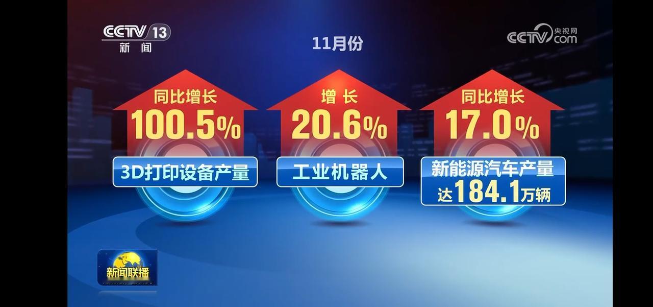 工业经济平稳运行,11月份工业机器人增长20.6%,新能源汽车产量达184.1万辆,同比增长17%
