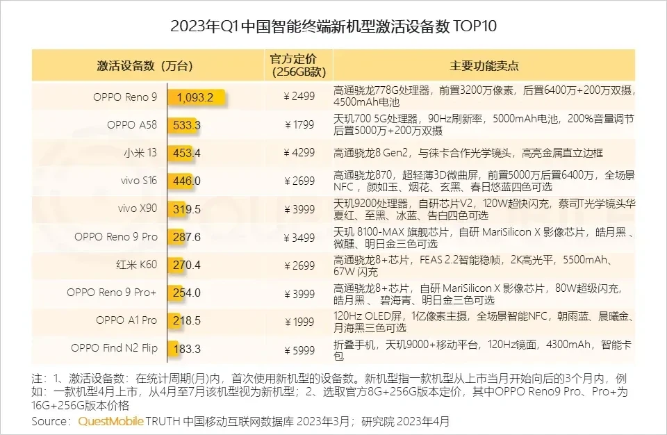 一季度453.4万台,还是低估了小米13的销量,2023年一季度中国智能终端新机激活设备数前10,OPPO很猛占了6款,小米和vivo各占2款,其中小米13的激活数也意外曝光了,一共有453.4万台。 小米13是我特别喜欢的一款手机,正面颜值很高,直角边框四等极窄,背面也是越看越舒服的那种,原本大家的预期都是在200万左右销量就算成了,现在看500万也不是终点,而且发布至今还没有降价。
