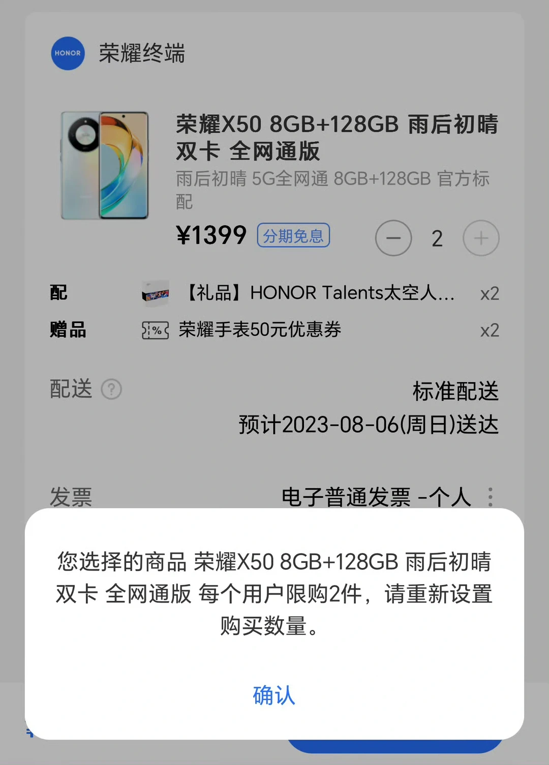 我大受震撼,荣耀1399的手机居然限购啦,一人只能入手2件,这就是荣耀X50 8+128g的雨后初晴版,以往厂家会限购的手机有哪些?限定版、联名款或者旗舰手机,为了营造销量良好得到现象,保持产品的热度和神秘感,或者为了保值限购,但荣耀X50不一样啊,1399的中低端手机,没有以上因素,只能说销量属实不错。看来几个点荣耀都抓住了消费痛点:1、十面抗摔,2、屏幕护眼,3、外观高端气派,4、1399起售价特有性价比。