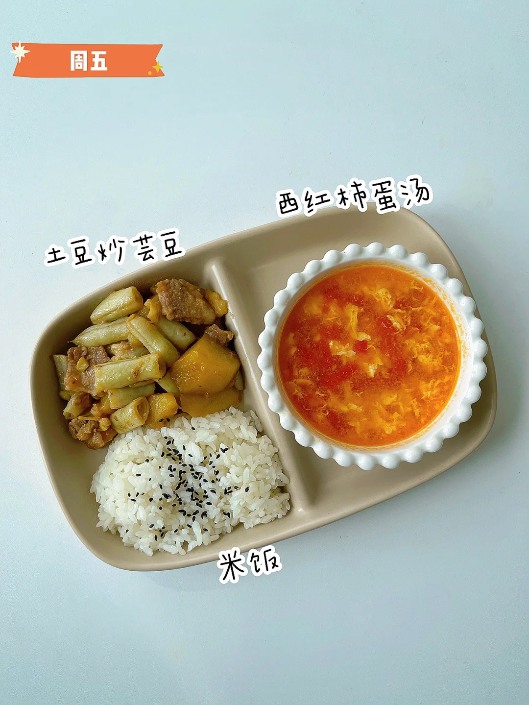 ✅周五:土豆炖芸豆、番茄鸡蛋汤、米饭