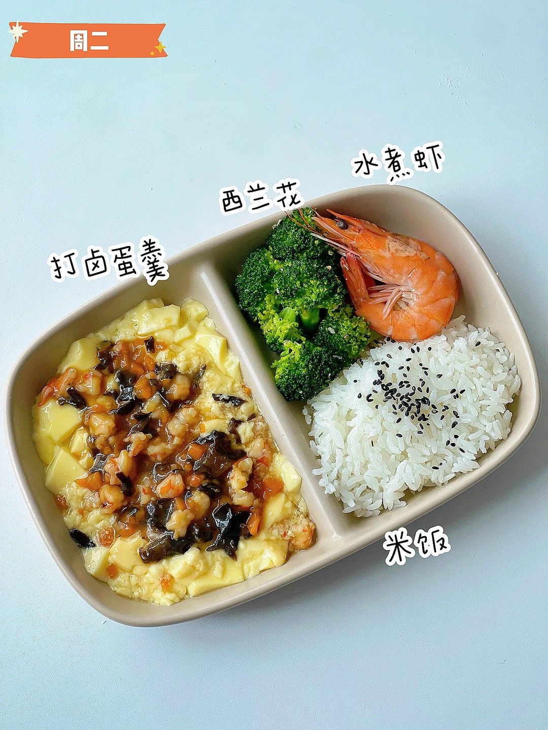 ✅周二:打卤蛋羹、水煮虾、清炒西兰花、米饭
