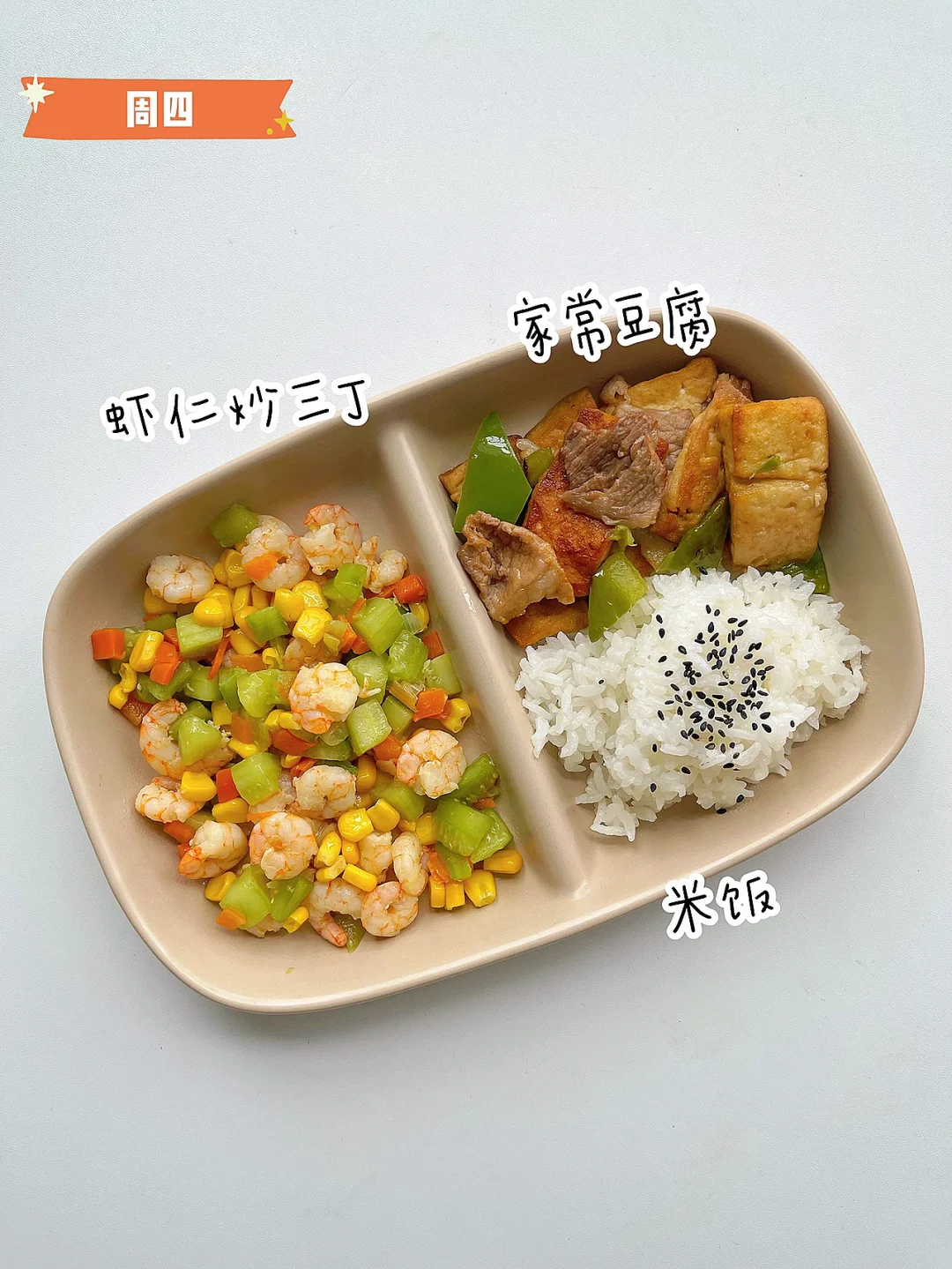 ✅周四:虾仁炒三丁、家常豆腐、米饭