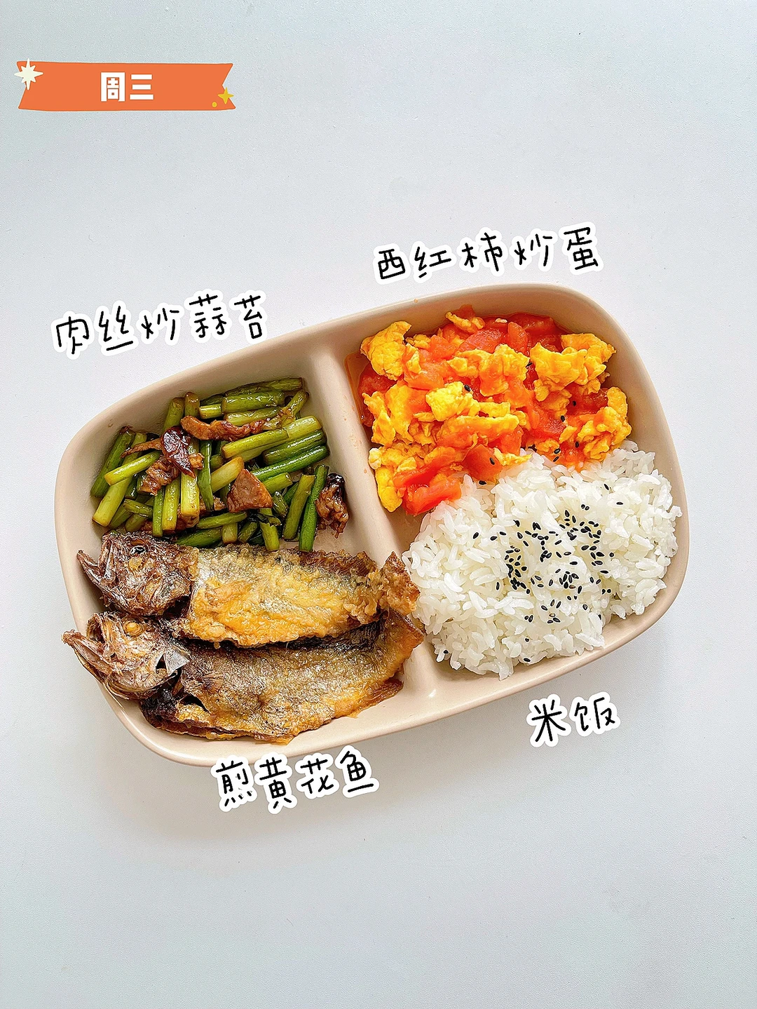 ✅周三:肉丝炒蒜苔、煎黄花鱼、西红柿炒蛋、米饭