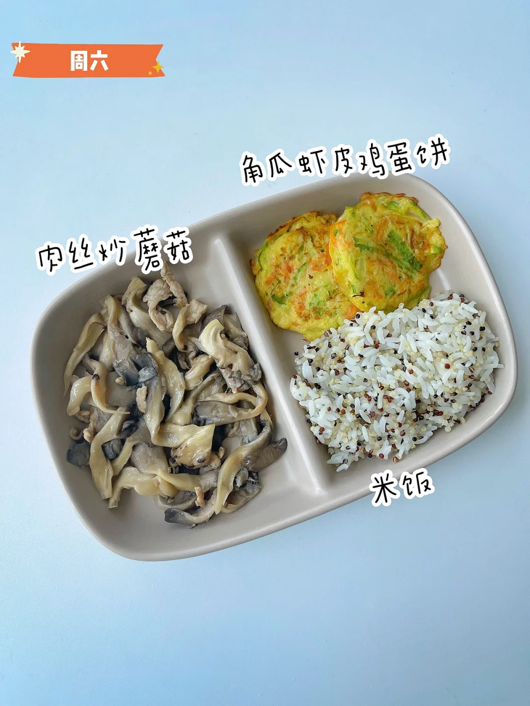 ✅周六:肉丝炒蘑菇、角瓜虾皮鸡蛋饼、米饭