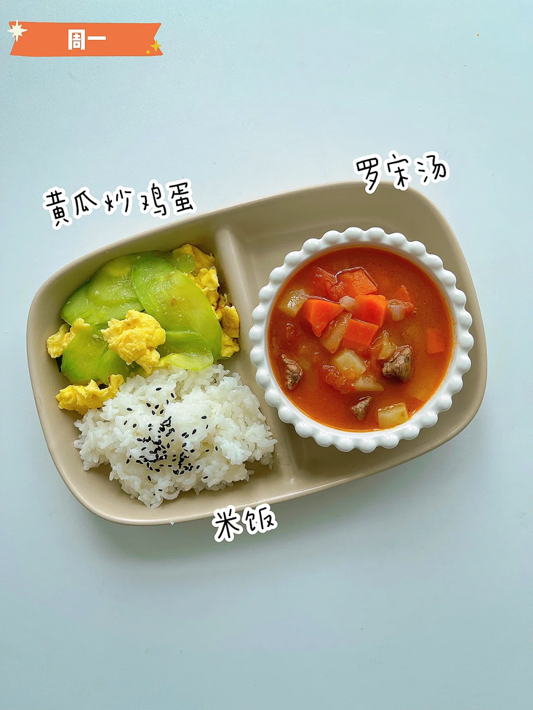 ✅周一:黄瓜炒鸡蛋、罗宋汤、米饭
