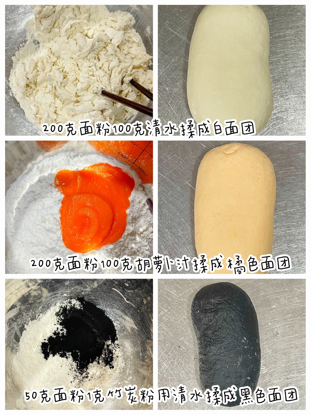 🔹橘色面团:胡萝卜蒸熟加水打成胡萝卜汁。100克胡萝卜汁加入200克面粉里揉成橘色面团.