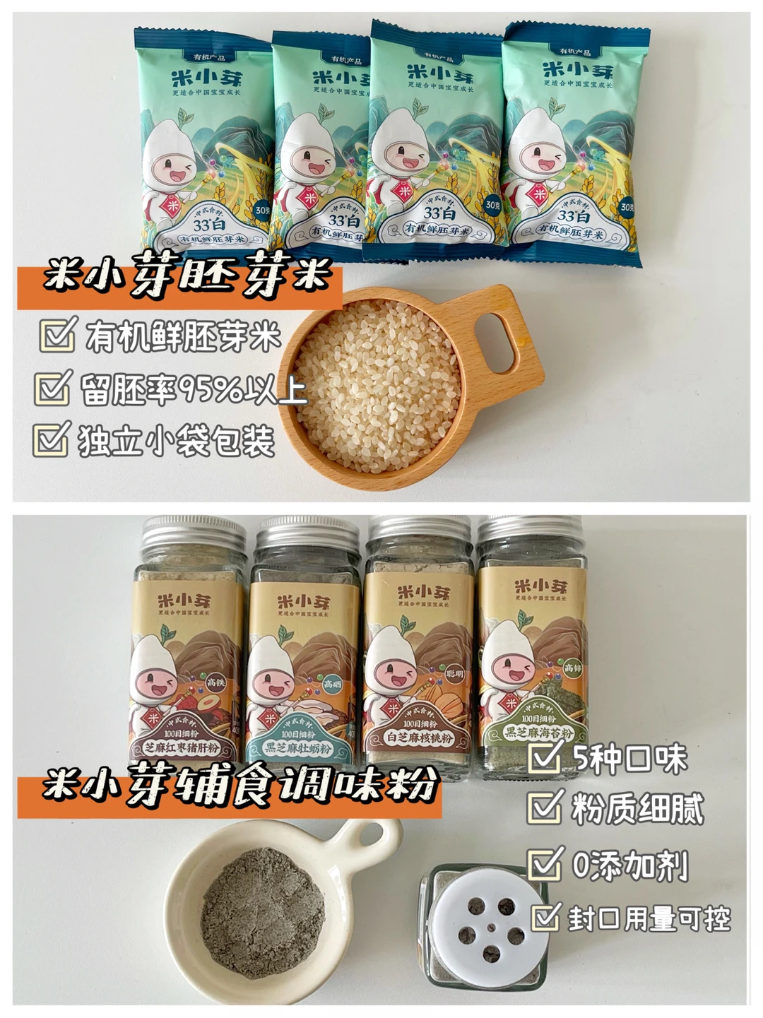 ️❤️辅食调味粉也是米小芽家的,有黑芝麻牡蛎粉、黑芝麻海苔粉、黑芝麻核桃粉、芝麻红枣猪肝粉、黑芝麻海虾粉5种口味,100目细度,0添加剂,特别加了营养价值hin高的大米胚芽粉,1岁下宝宝用来调味再合适不过了。米小芽还换了国潮风的新包装,对我这个老用户来说真的是惊艳到啦!