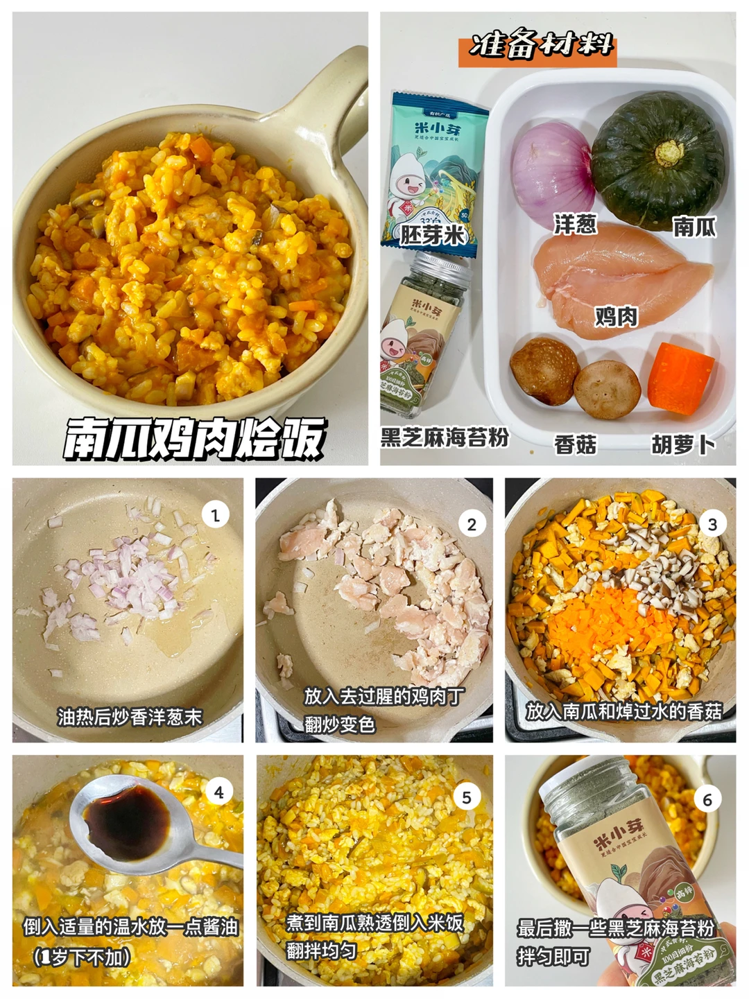 🔹制作方法:油热后炒香洋葱,放入去过腥的鸡肉丁翻炒变色,放入南瓜丁和焯过水的香菇,翻炒变软,倒入适量的温水1岁上可加一点酱油,煮到南瓜熟透拌入米饭,撒上一些芝麻海苔粉拌匀