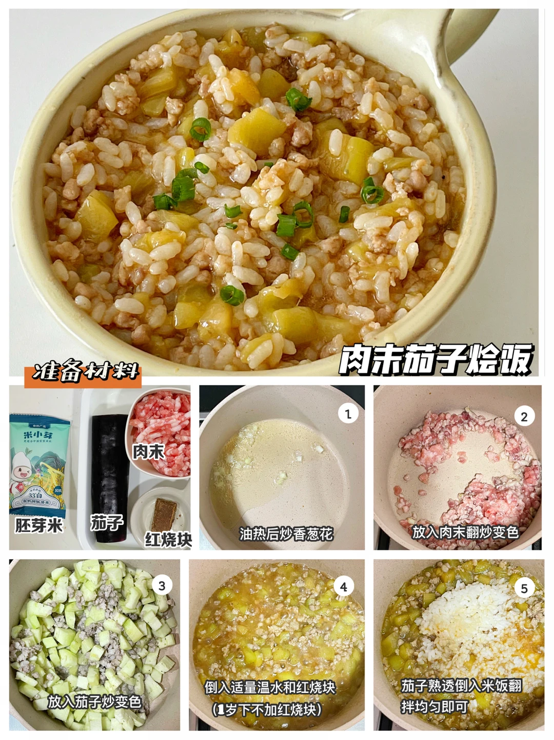 🔹制作方法:油热后炒香葱花,倒入肉末翻炒变色,倒入茄子翻炒变软,倒适量的温水和红烧块(1岁下不加)煮到茄子软烂拌入米饭即可