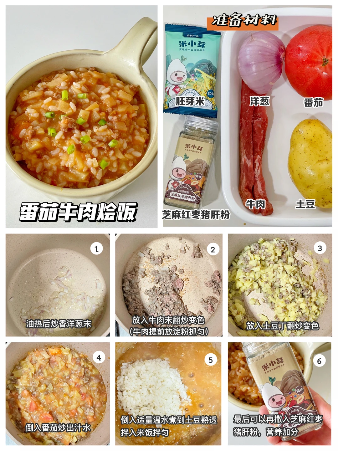 🔹制作方法:油热后炒香洋葱末,放入去过腥的牛肉末翻炒变色(牛肉末提前加淀粉拌匀)放入土豆丁炒到变色,放入番茄炒一会,倒入适量的温水(可加一点番茄酱)煮到土豆软烂拌入米饭,最后撒一些芝麻红枣猪肝粉,营养更加分哦。