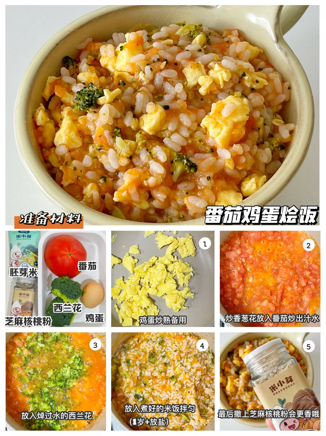 🔹制作方法:鸡蛋炒熟备用。油热后倒入番茄炒出汁水,倒入焯过水的西兰花(1岁+可加盐)拌入煮好的米饭,最后撒一点芝麻核桃粉拌匀即可