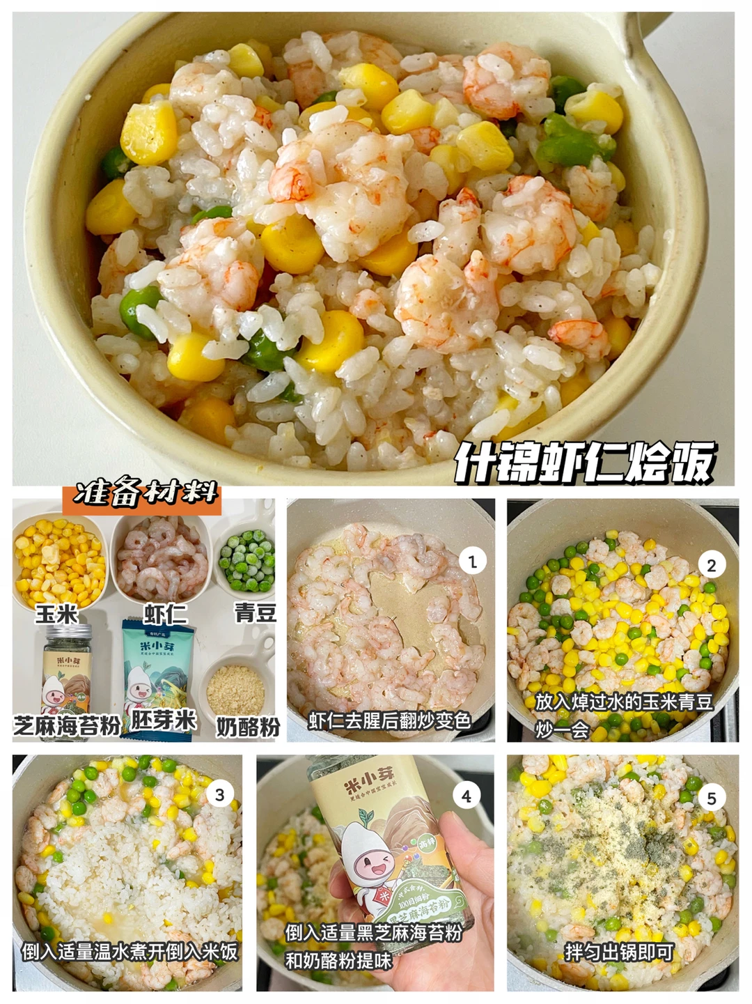 🔹准备材料:虾仁、玉米、青豆、胚芽米、芝麻海苔粉、奶酪粉
