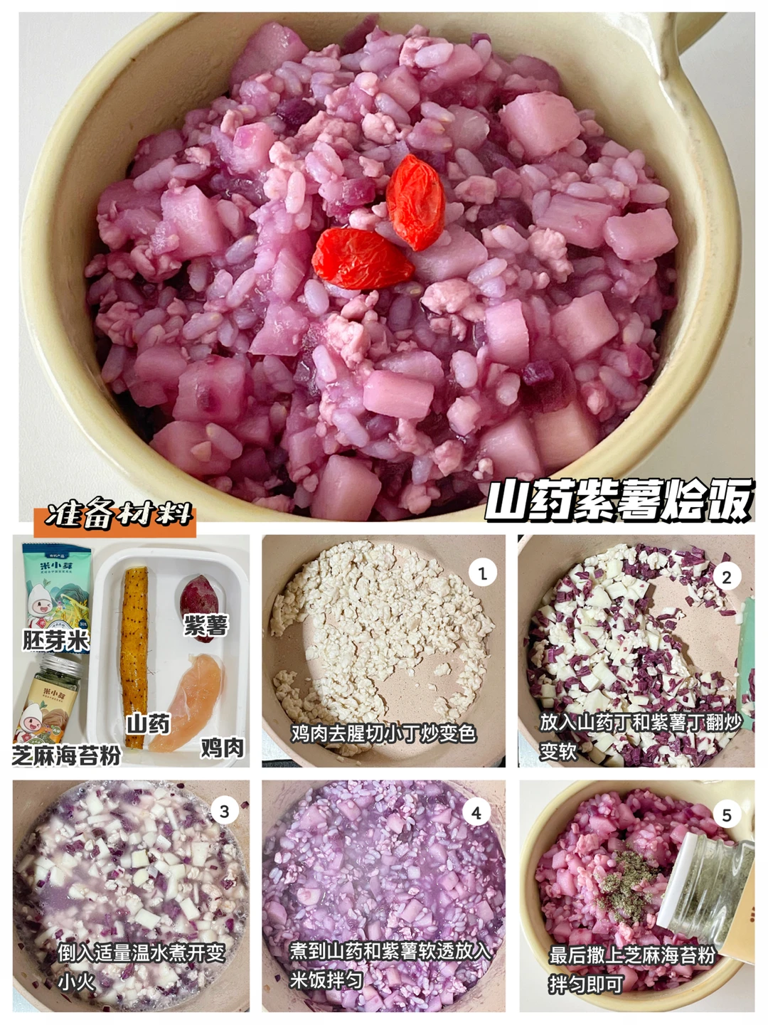 🔹制作方法:鸡肉去腥切小丁,油热后翻炒变色,倒入山药丁和紫薯丁翻炒变软,倒入适量温水煮开转小火继续煮,煮到食材软透拌入米饭,撒上芝麻海苔粉拌匀