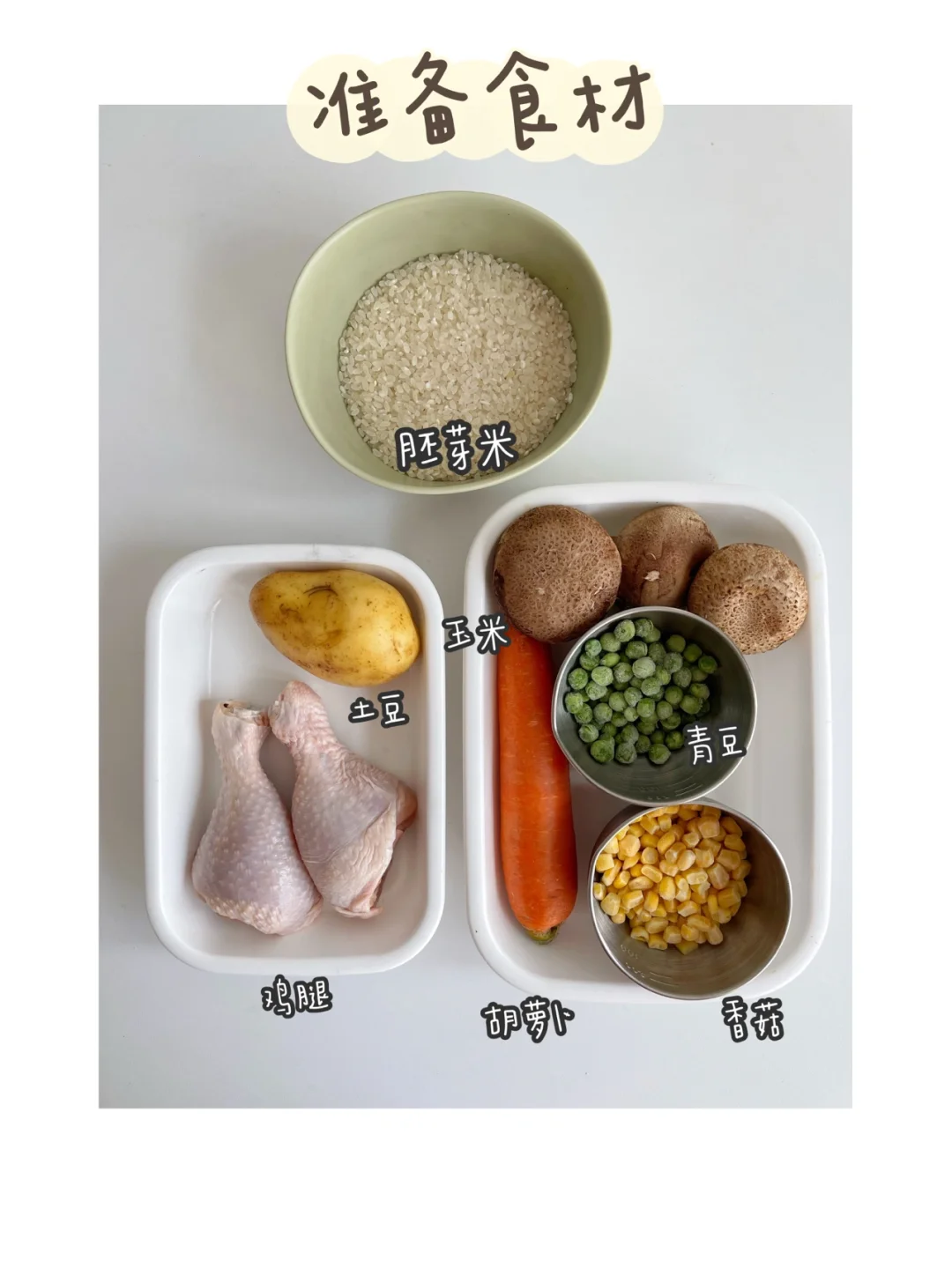 ✅准备食材:鸡腿、香菇、土豆、胡萝卜、玉米、青豆、胚芽米。