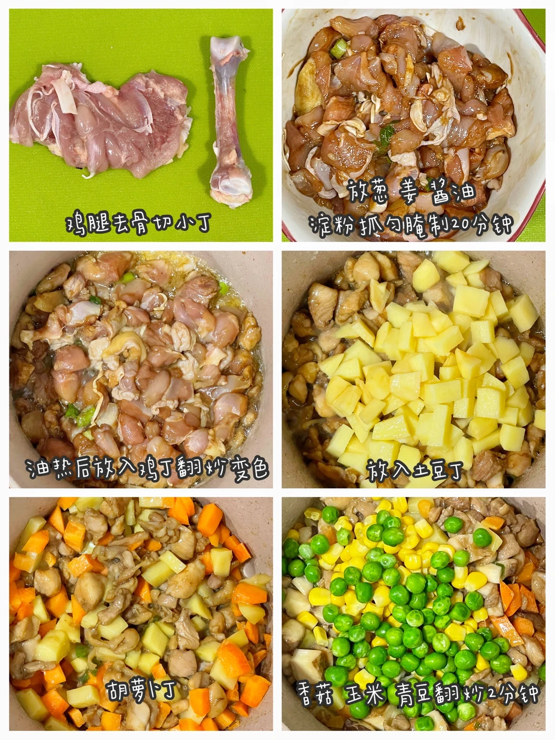 🔹油热后放入鸡块翻炒变色,放入香菇丁、玉米、青豆、土豆翻炒2分钟左右.