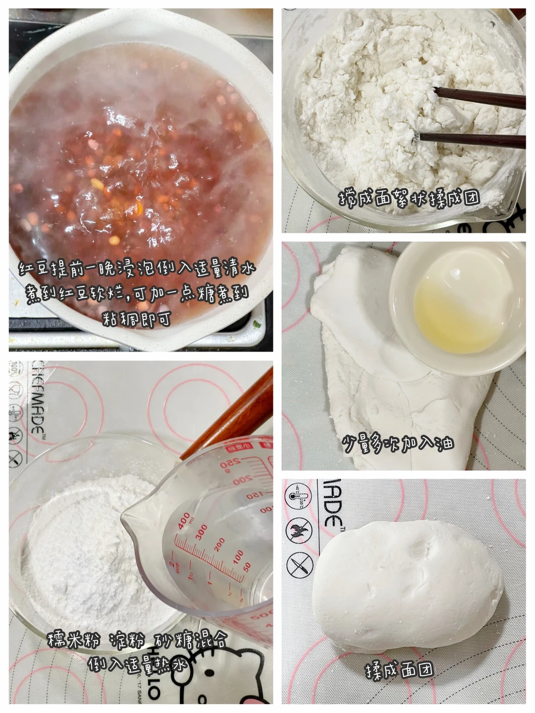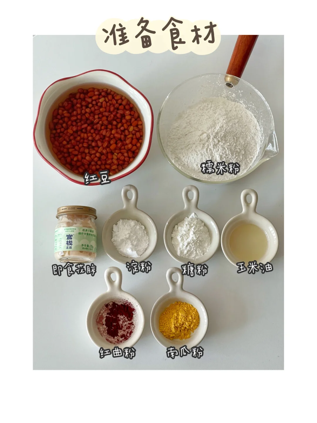 🔹糯米粉+淀粉+砂糖混合,用热水搅成面絮状揉成团,少量多次的加入油,揉成面团。分成3份,其中两份用用南瓜粉、甜菜根粉调色揉成团。