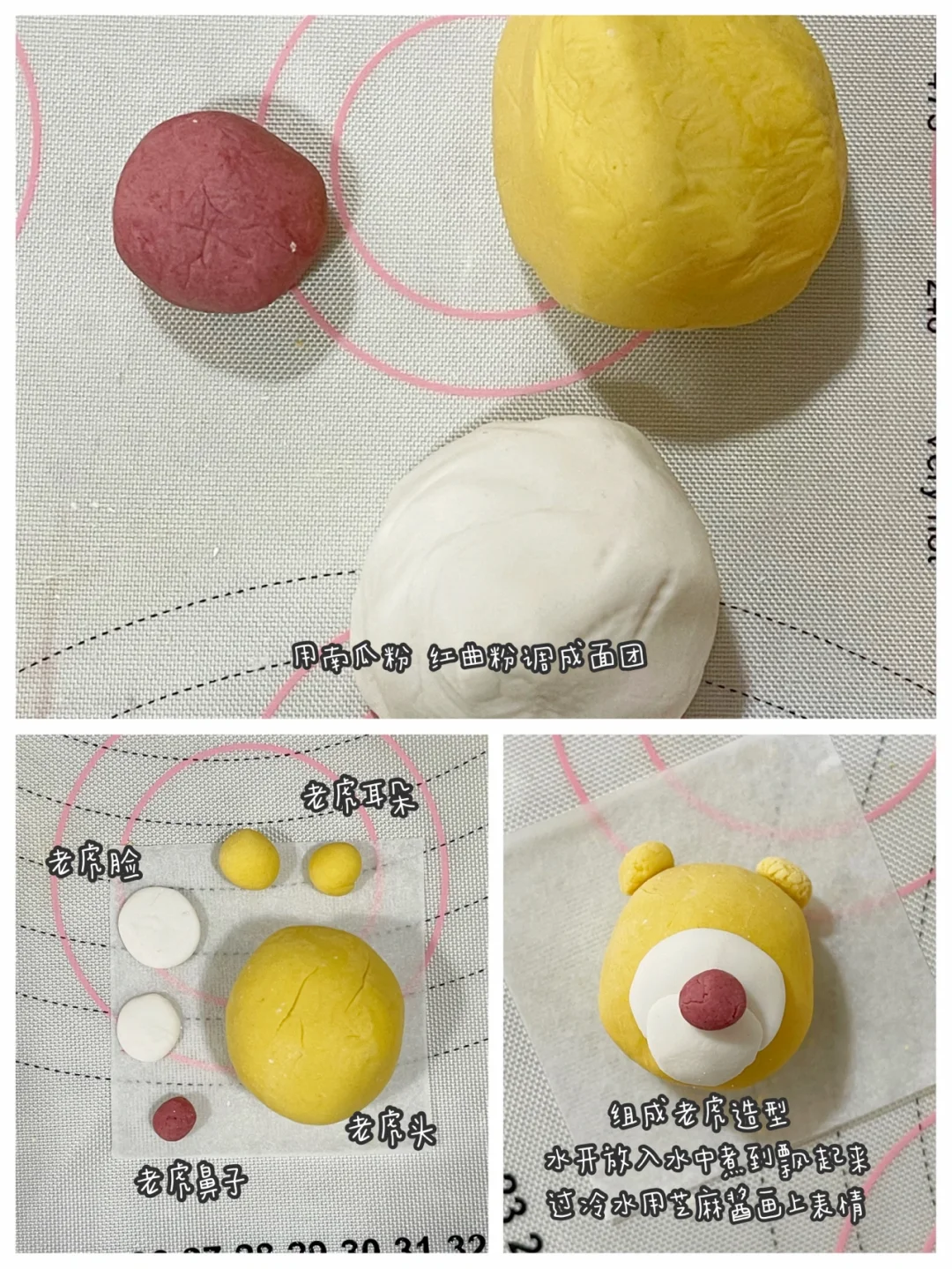 🔹黄色面团用来做老虎头和耳朵,红色面团用来做鼻子,白色部分用来做老虎脸.组合成老虎后,放入沸水中煮熟,捞出过凉水。用芝麻酱画上眉毛、眼睛和胡子即可。