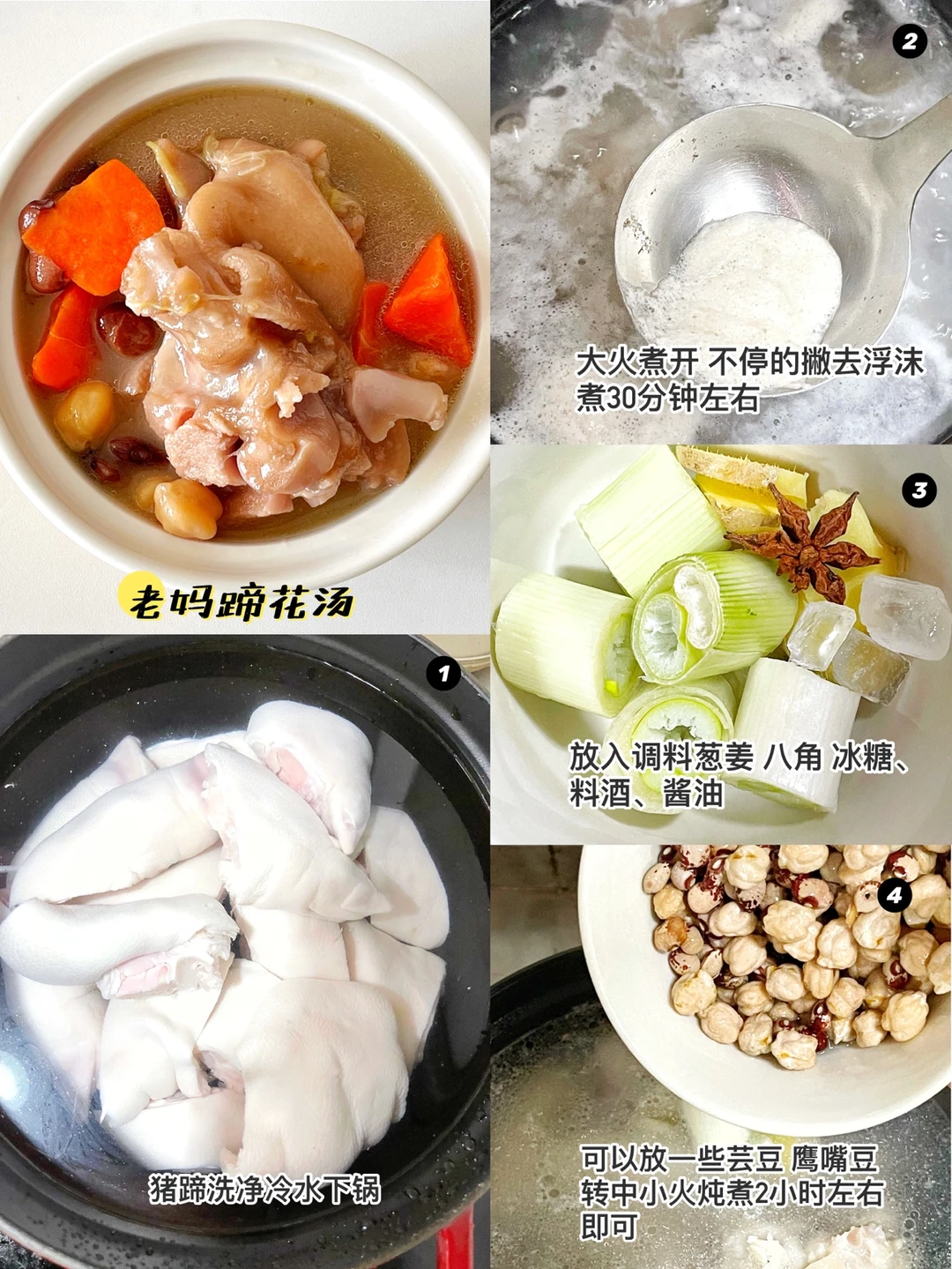 🔹制作过程:猪蹄多泡几遍水洗净。冷水下锅。大火煮开,煮开的过程中不停的撇去浮沫,煮30分钟左右。放入调料(葱姜、八角、冰糖、适量的料酒和酱油)还可以放一些芸豆、鹰嘴豆一起煮。转中小火炖煮2个小时即可。