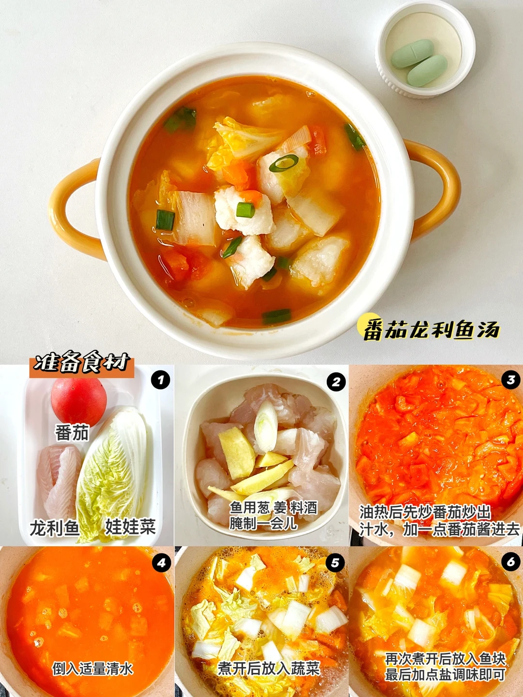 🔹制作过程:龙利鱼用葱、姜、料酒腌制一会。油热后放入番茄炒出汁水,加一勺番茄酱,倒入适量清水,煮开后放入蔬菜,再次煮开后放入裹上淀粉的鱼块,最后盐调味即可。