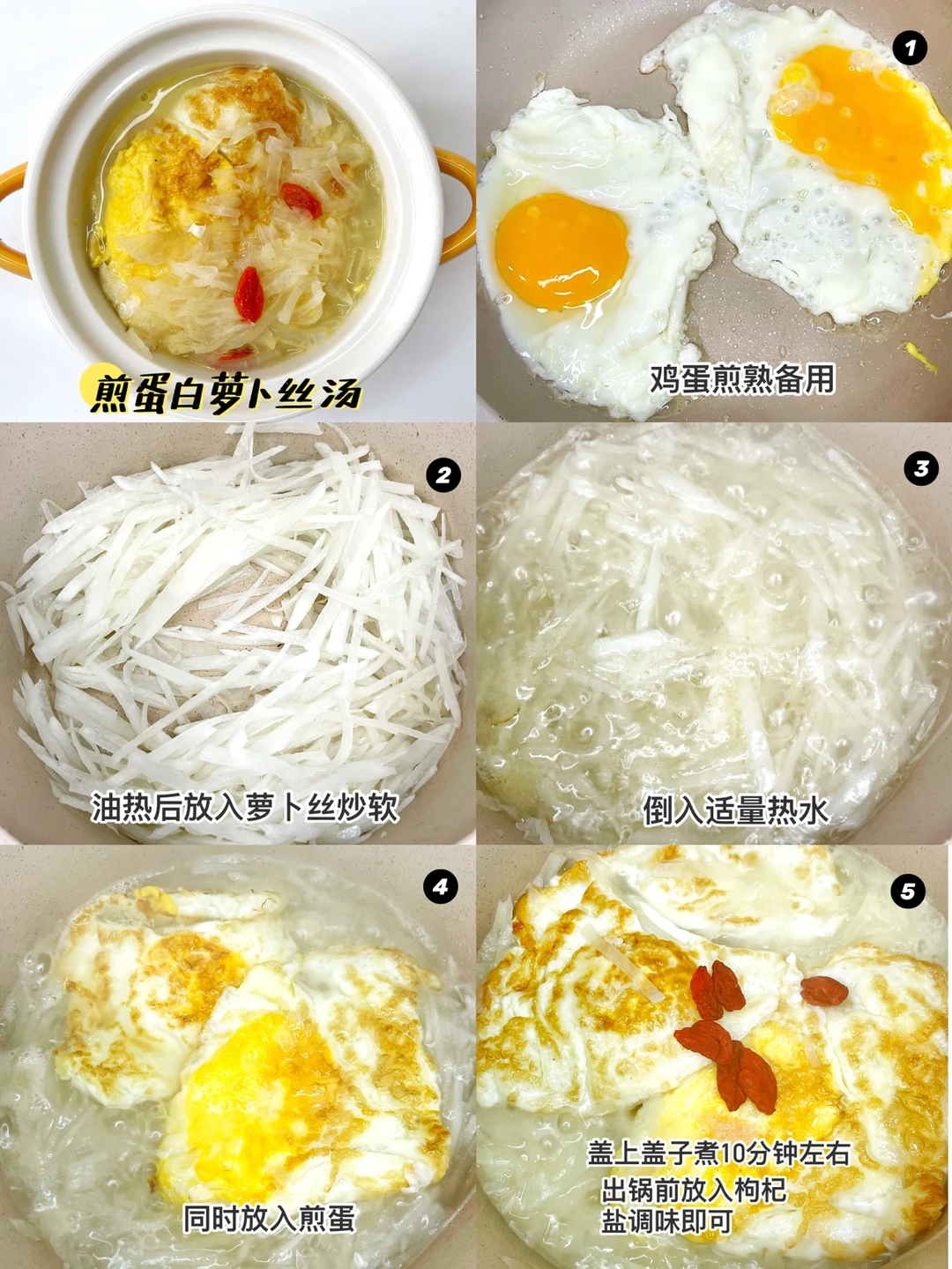 🔹制作过程:鸡蛋煎熟备用(1个2个都可以)。锅中油热后放入白萝卜丝翻炒变软。倒入适量的热水,同时放入煎蛋。盖上盖子煮10分钟左右,放枸杞,加盐调味即可。