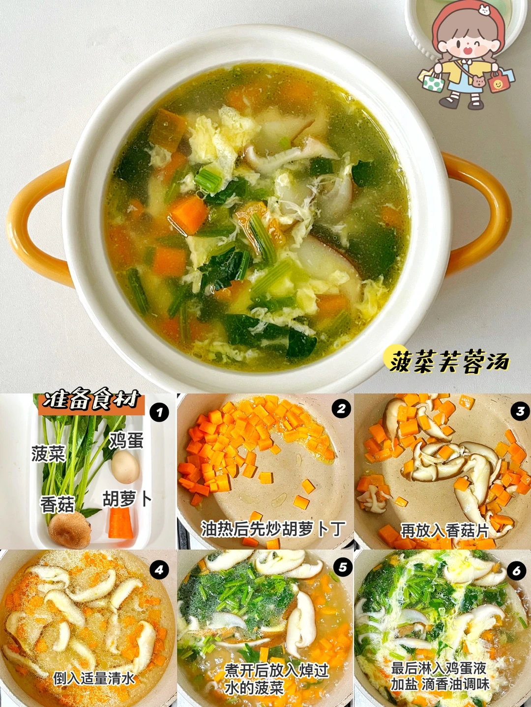 制作过程:油热后先炒胡萝卜,再放入香菇片翻炒一下,倒入适量清水,煮开后放入焯过水的菠菜,淋入鸡蛋液,加盐调味,关火滴几滴芝麻油。