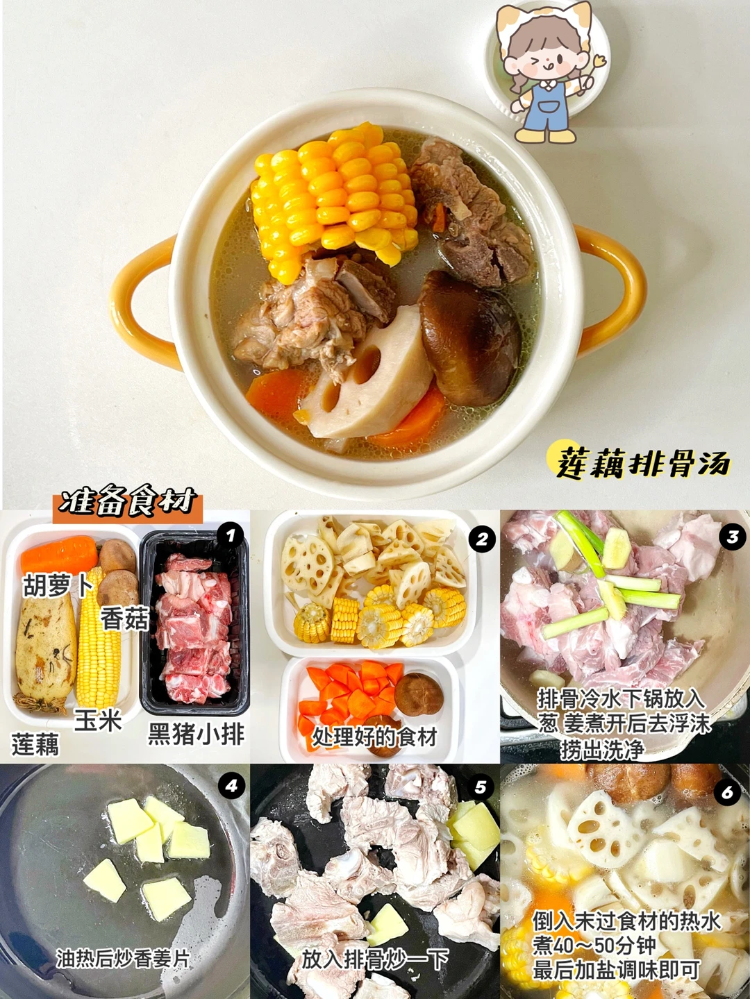 🔹准备食材:黑猪小排、莲藕、胡萝卜、玉米、香菇