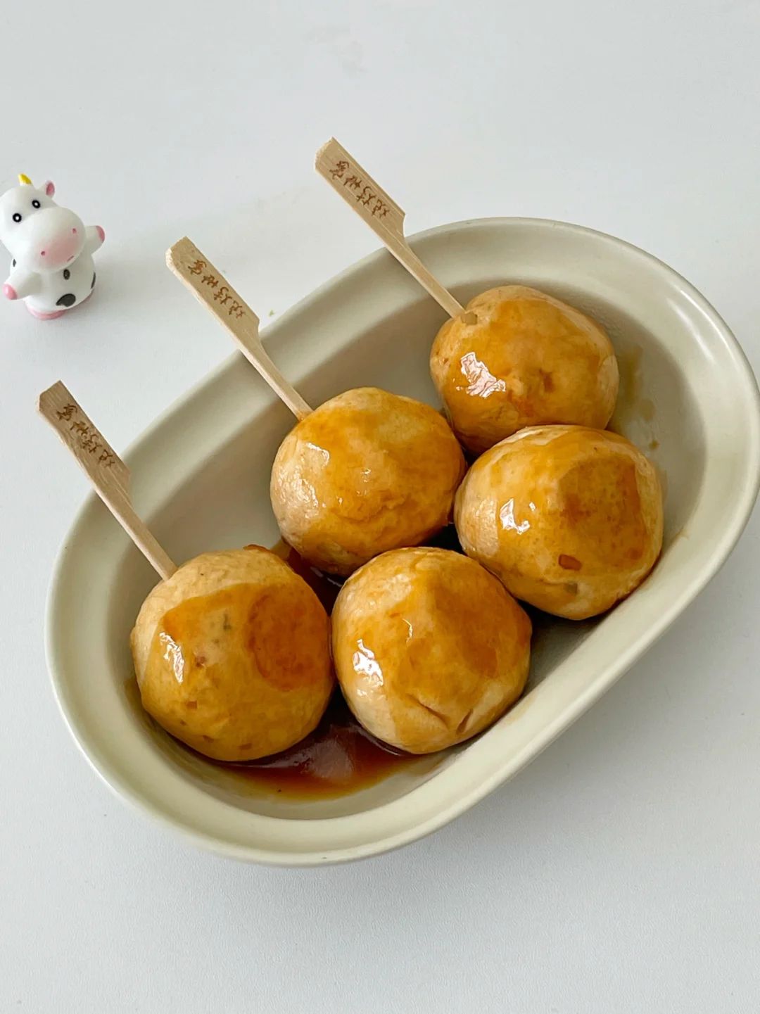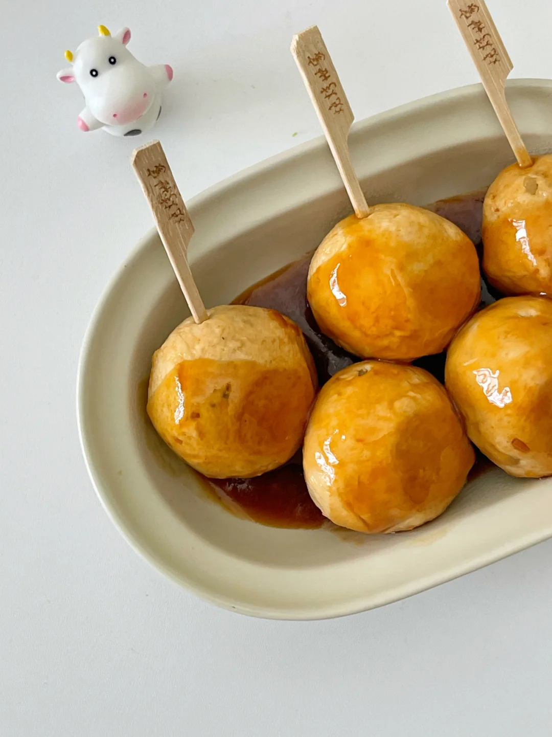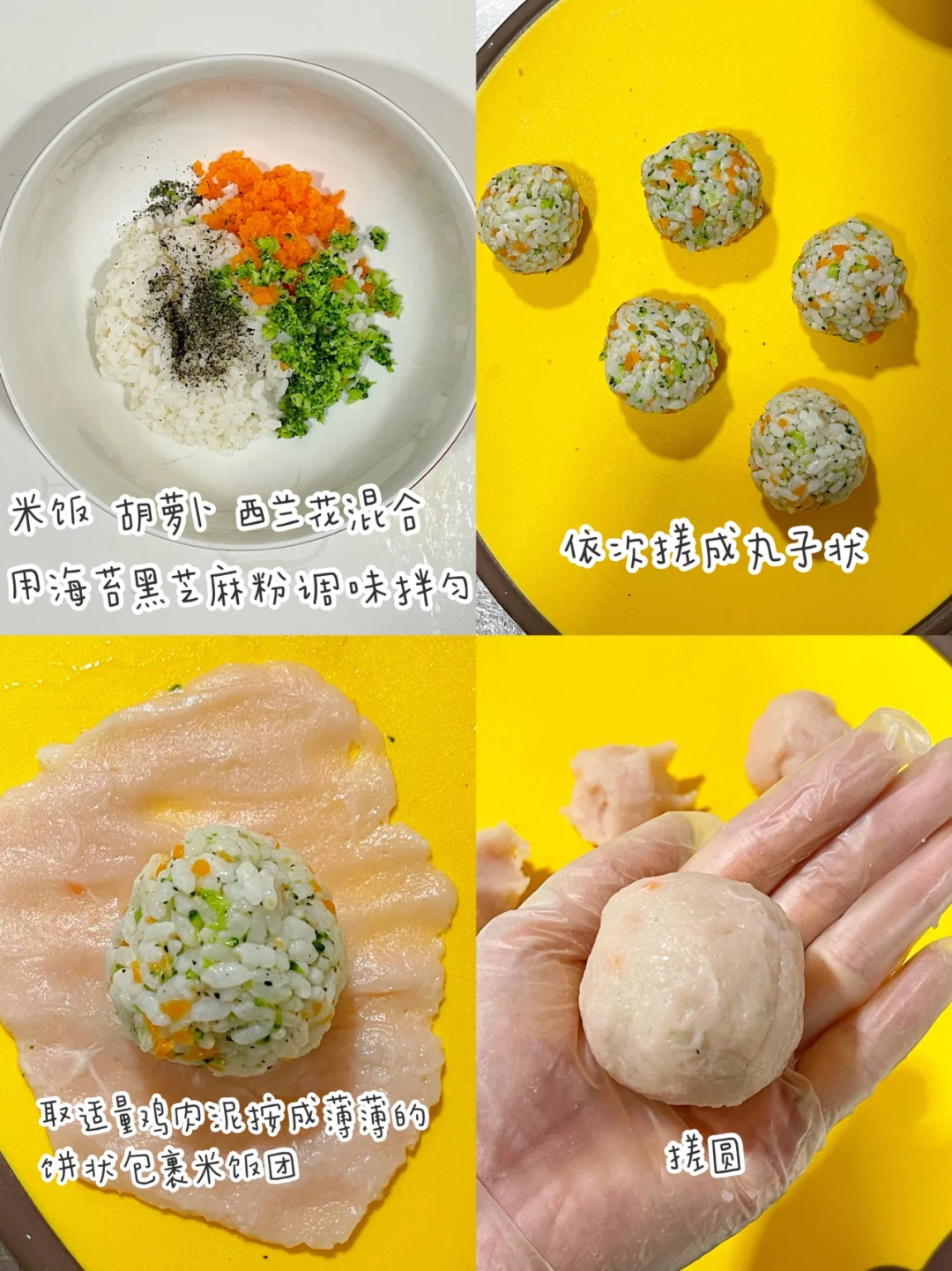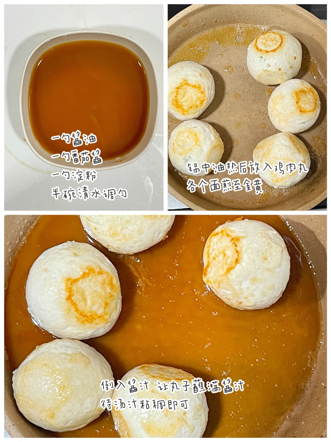 🔹取适量鸡肉泥按成薄薄的饼状包裹住饭团,再用手搓圆(操作的时候手沾水,更好操作)依次做完所有的食材。🔹锅中油热后,放入鸡肉丸,中小火各个面煎至金黄。倒入调好的酱汁,让丸子均匀的沾匀,待汤汁粘稠,出锅即可。