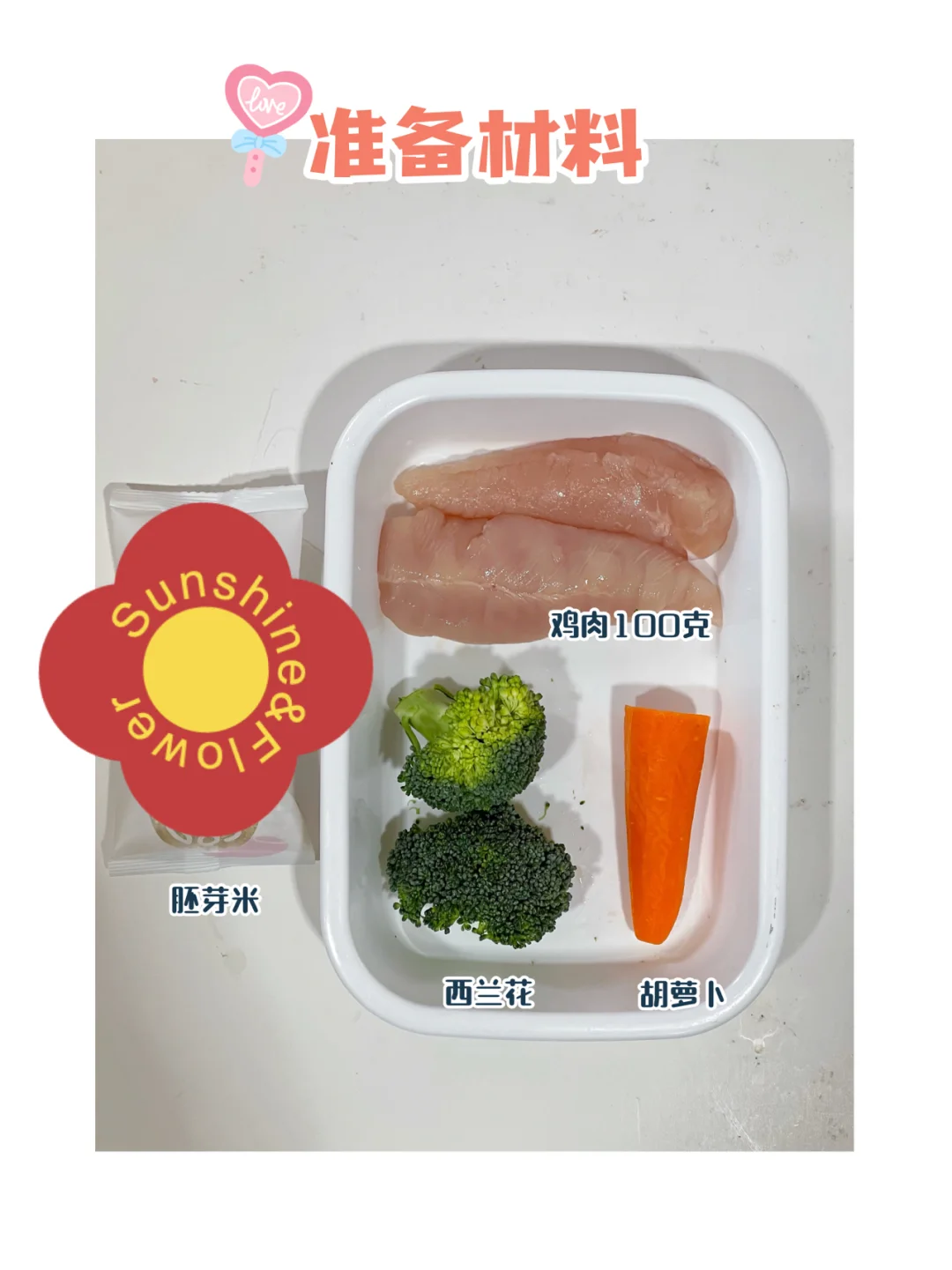 ✅准备材料:胚芽米、鸡肉、西兰花、胡萝卜。