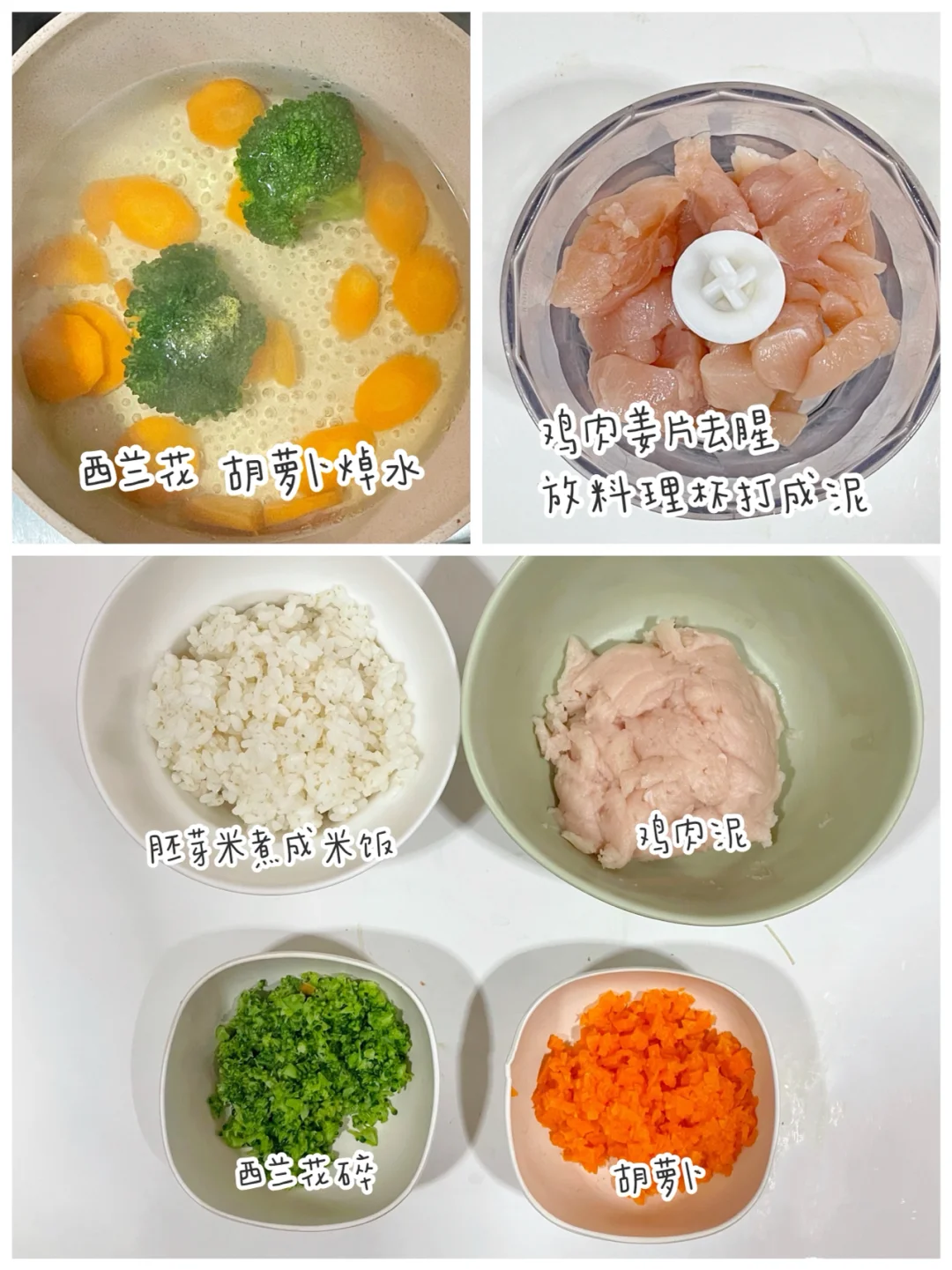 🔹鸡肉用姜片去腥切块放料理杯打成泥。西兰花和胡萝卜焯水切碎末。