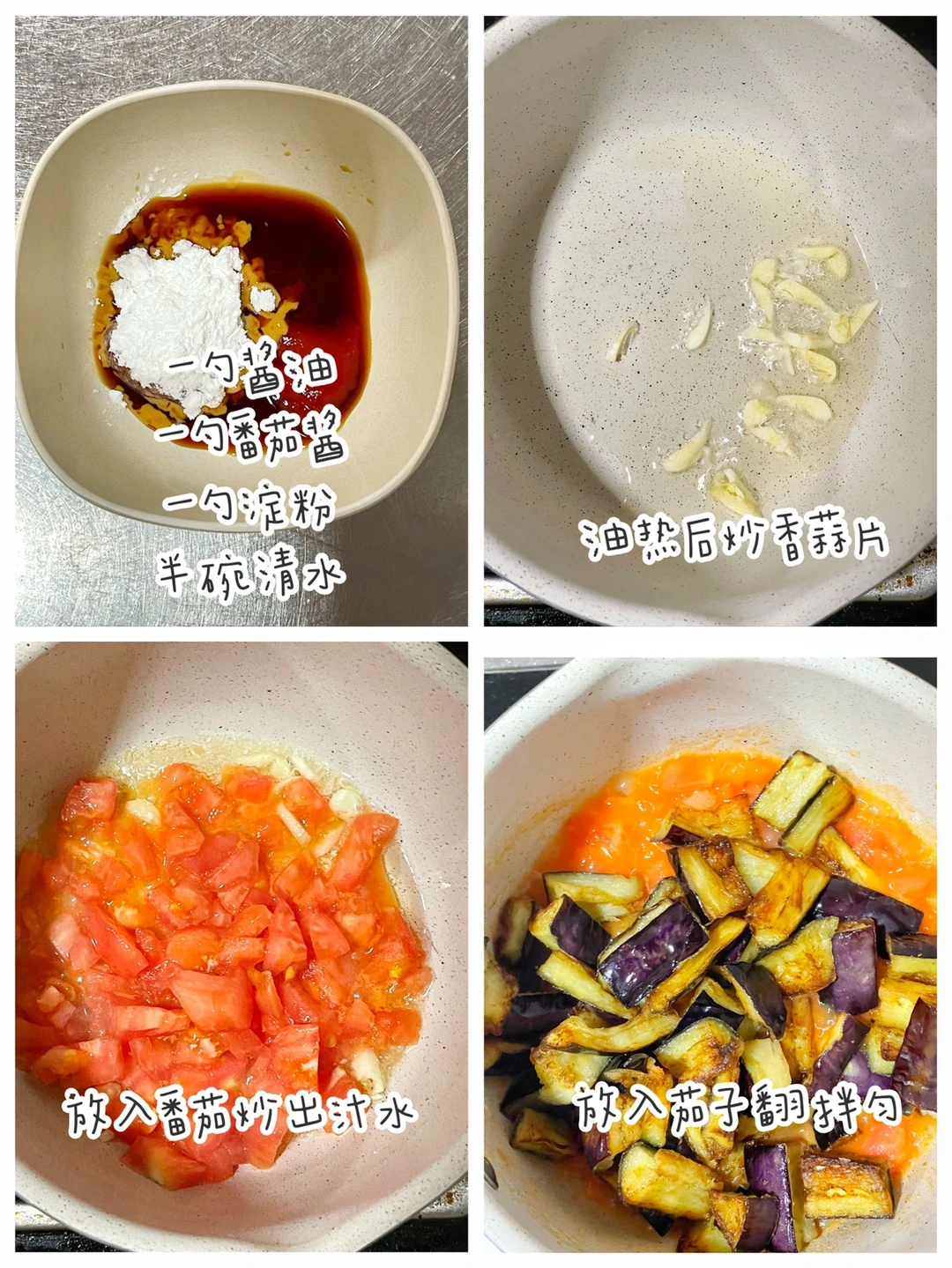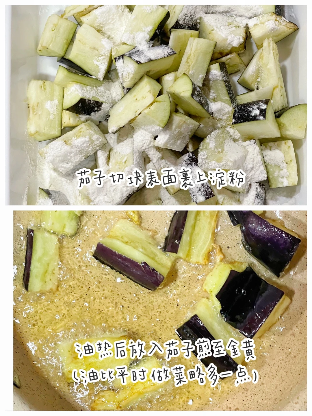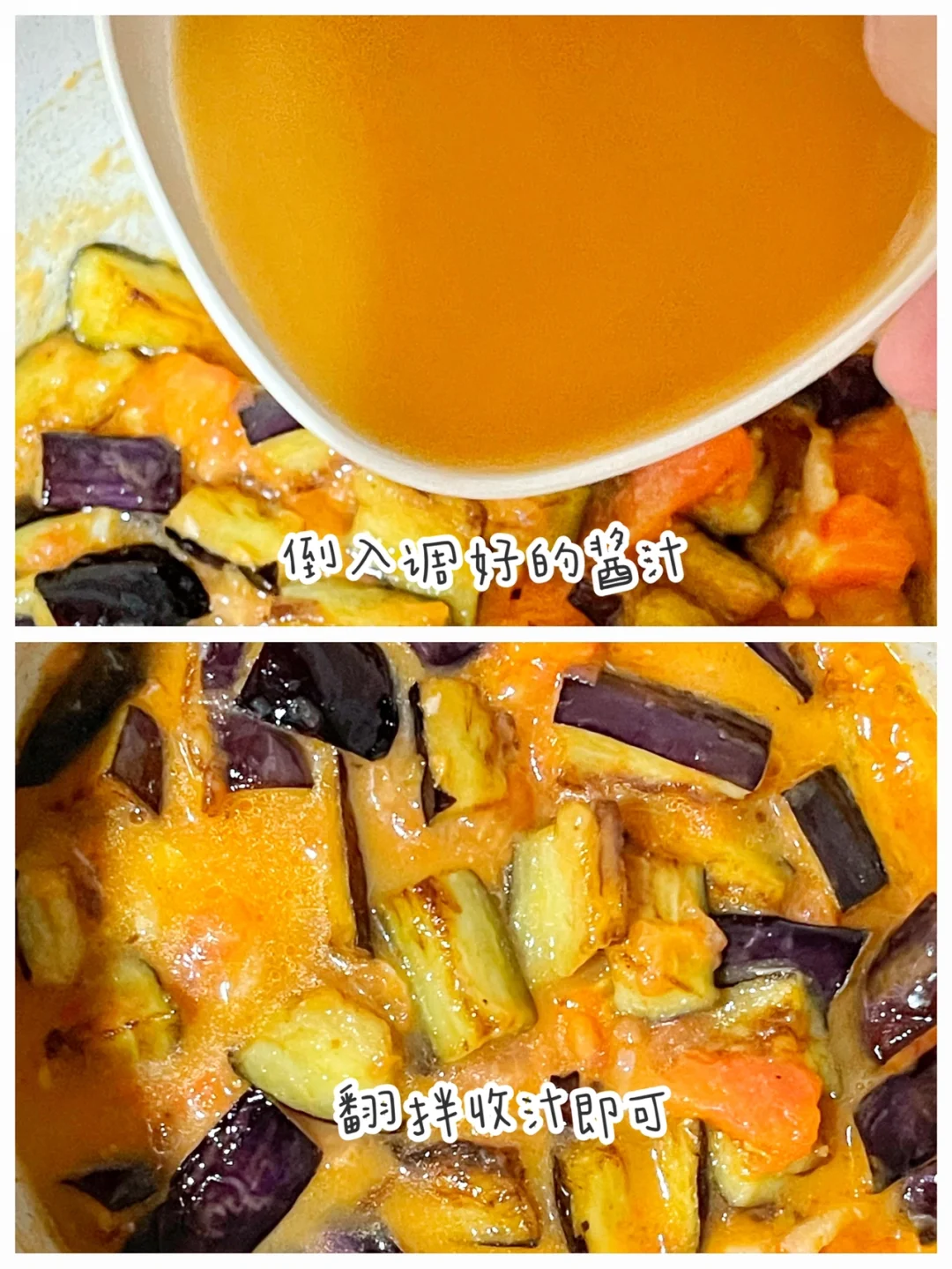最近天气开始热起来,宝宝也会因此变得食欲不太好,今天做了超下饭的鱼香茄子,配上米饭,绝了,宝宝吃的太香了[斜眼R] ⬇️制作方法:⬇️ 🔹茄子切块,表面裹上淀粉。 🔹锅中油热后放入茄子煎至金黄(油比平时炒菜多放一点) 🔹调一个酱汁:一勺酱油—+一勺番茄酱+一勺淀粉+半碗清水。 🔹另起一锅,炒香蒜片,放入番茄炒出汁水。 🔹放入茄子翻拌均匀,倒入调好的酱汁,翻拌收汁即可。💕真的太太太好吃啦,快安排起来吧。