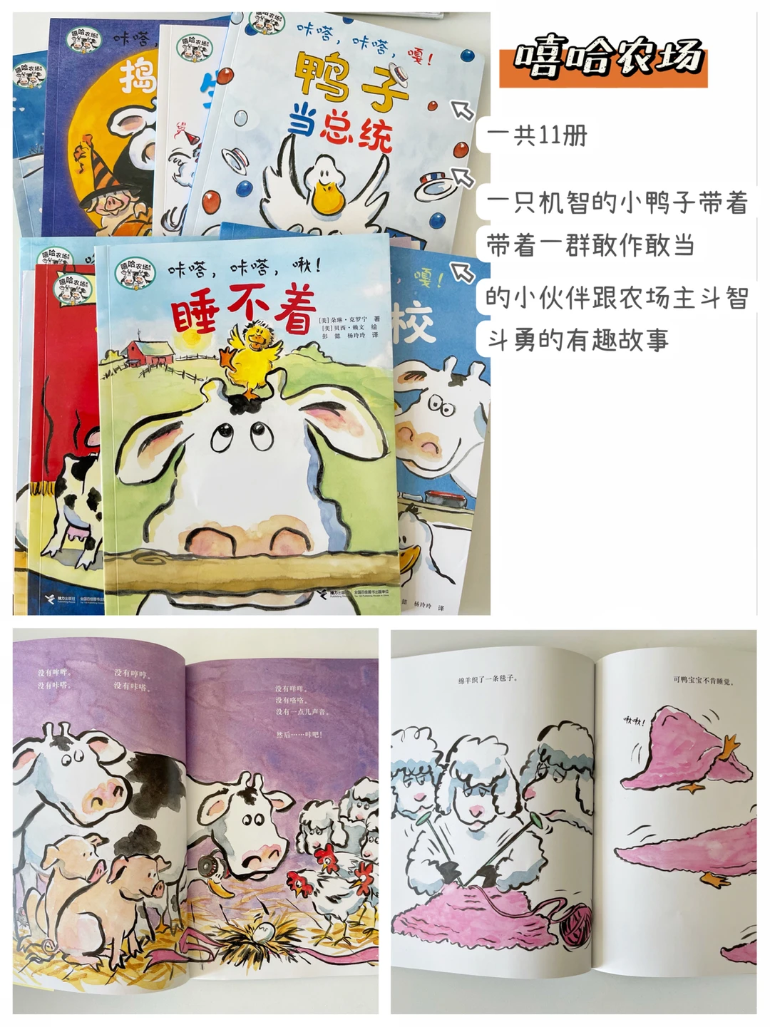 一共11册,这套绘本真的非常有趣,一只机智的鸭子、带着一群敢作敢当的小伙伴跟农场主斗智斗勇,看着动物的计谋一次次达到目的,孩子们都会被它们的机智、幽默所折服,学会用幽默的智慧化解成长危机。